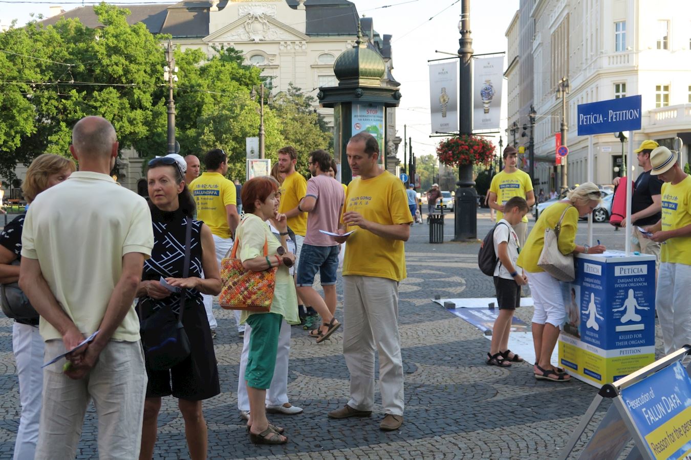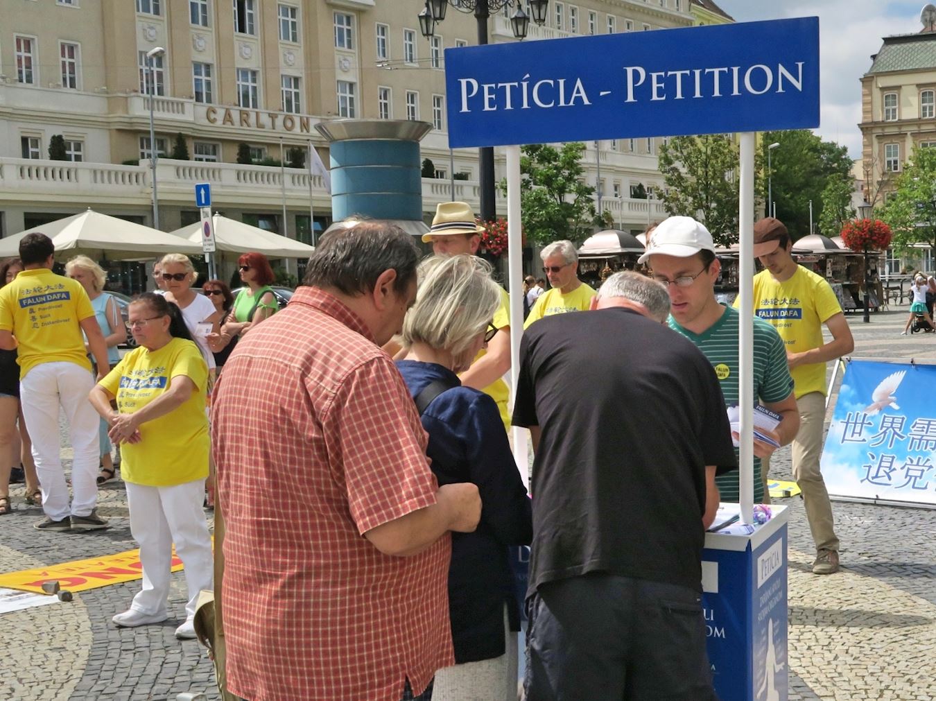 一位路过的老人表示,这种迫害行为是共产党政权的特征。他自己受到捷克斯洛伐克社会主义共和国前政权的迫害,因此他对人们遭受迫害有深刻的理解。他希望法轮功学员的努力能大获成功,并说这些行动非常重要。