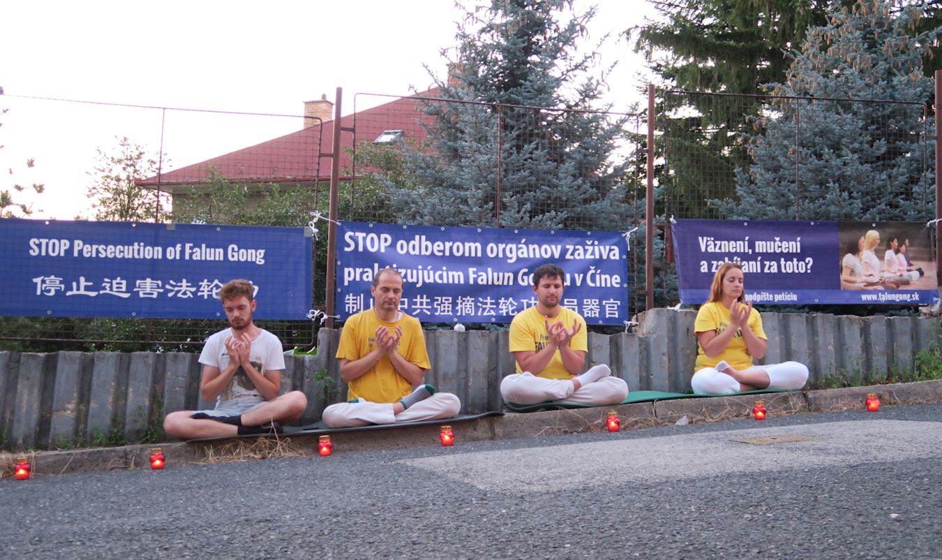 七月十九日,在中共驻布拉提斯拉瓦大使馆门前,学员们展开了一场为中国法轮功学员自由修炼的十二小时接力请愿,目的是呼吁停止对中国法轮功学员的持续十九年的迫害。在活动期间,学员向路人展示了功法,同时揭露中共在中国血腥迫害法轮功学员的信息。