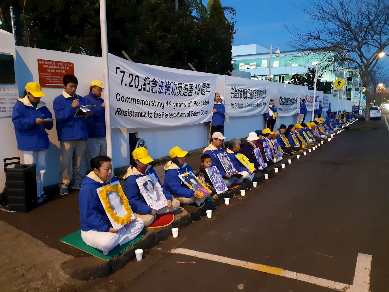 傍晚时分,天色渐暗,法轮功学员们来到了中领馆,燃起点点烛光来纪念在这十九年里被中共迫害致死的无辜善良的法轮功学员。