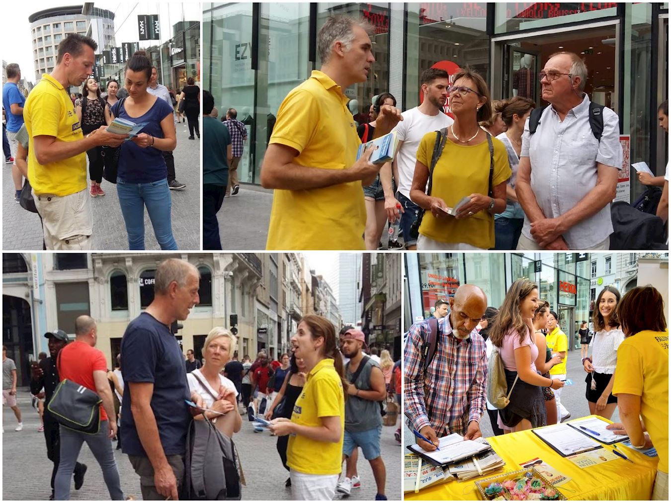 法轮功学员们还来到布鲁塞尔市中心,举办弘法活动。虽然不是周末,市中心依然人流如织。过路行人中有好些已经听说过法轮功和学员被迫害的事情。