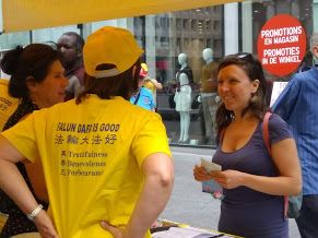 杜申(Duchesme )女士的哥哥在加拿大,经常打坐冥想,她听哥哥说过法轮功,还听到她同事说起过法轮功受迫害的事情。今天在布鲁塞尔看到了法轮功的展台,马上就决定要签名支持。