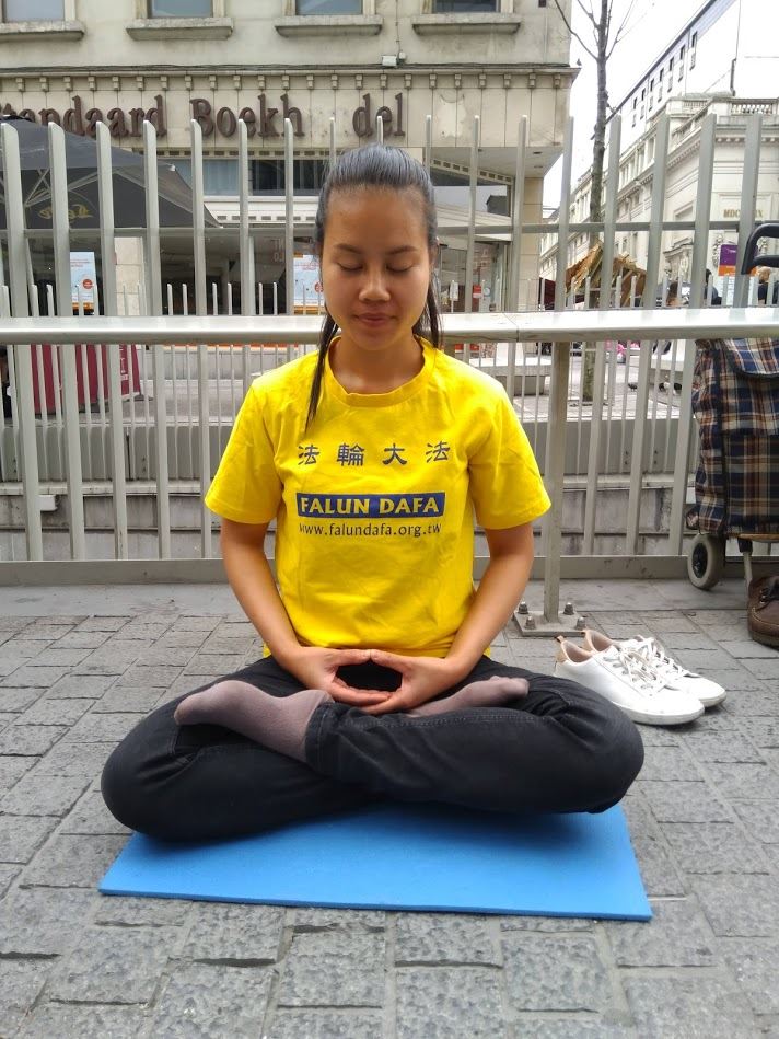 参加下午市中心的活动的学员中,来自越南,二零一六年刚刚得法的年轻学员Nguyen Thu Hoai Thu,修炼法轮功快到一个月的时候,在修炼第二套站桩功法时,感觉仿佛有一只大手从她心口揪出一些东西,从此,她的身体强壮起来。她特别喜欢炼第五套功法打坐,她说那会给她带来身心的平静和祥和。也正因为如此,她特别喜欢市中心的活动。目光凝视着商业街来来往往的人潮,她感慨道:“我特别希望他们都能来修法轮功,特别希望,希望他们都能感受这种祥和美好。”