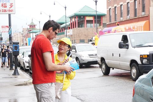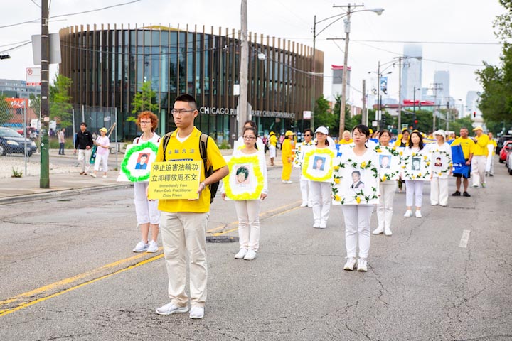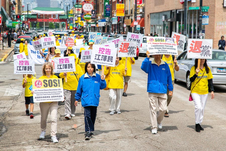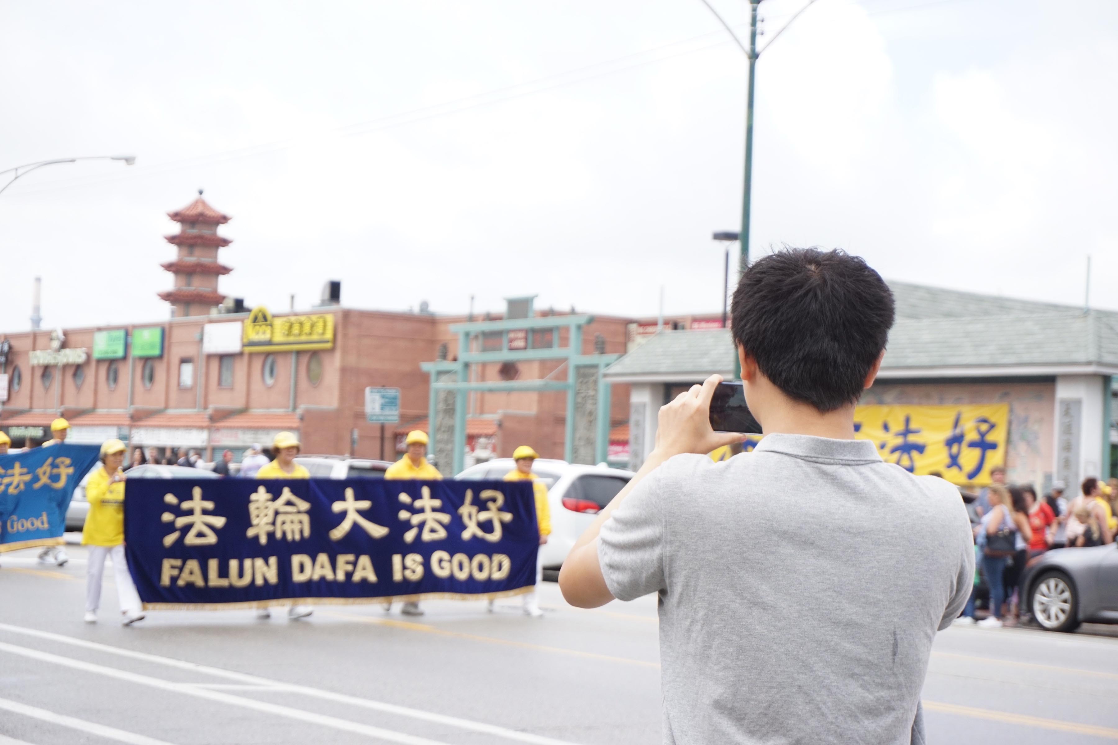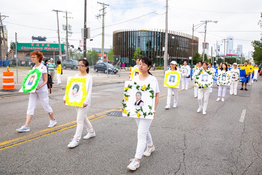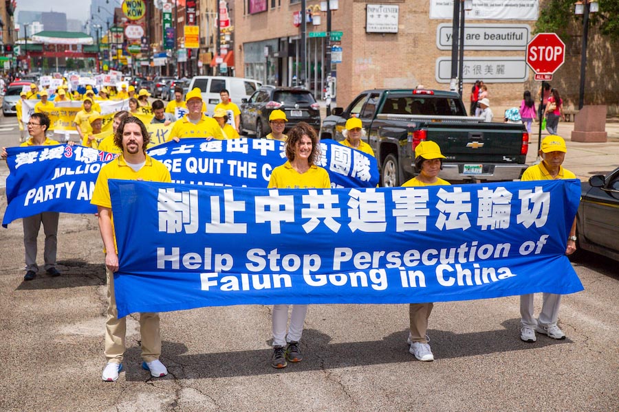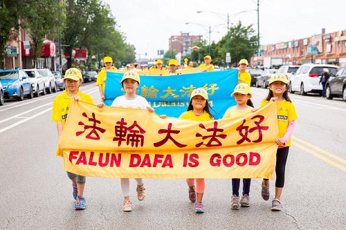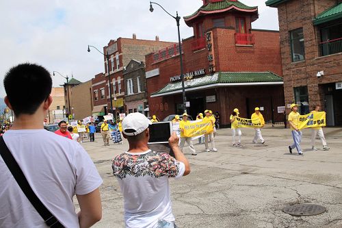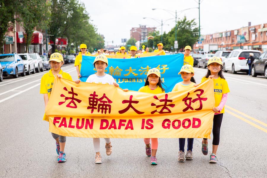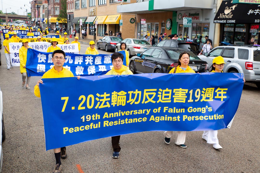 美国第三大城市芝加哥,其市中心的唐人街是美国东部规模最大、最繁荣的唐人街之一。法轮功学员们手持中英文“法轮大法好”、“真善忍”和“七二零法轮功反迫害19周年”等大型横幅,走上中国城中心的永活大街,在刻有孙中山手书的“天下为公”的地标式牌楼下穿过,路过著名的华阜广场,向中西方民众传递真相,呼吁制止迫害。