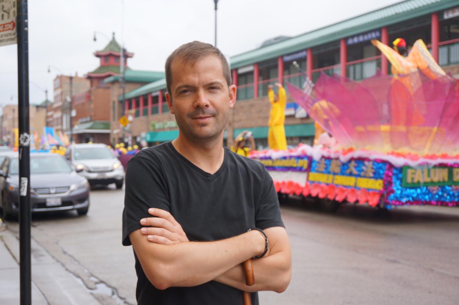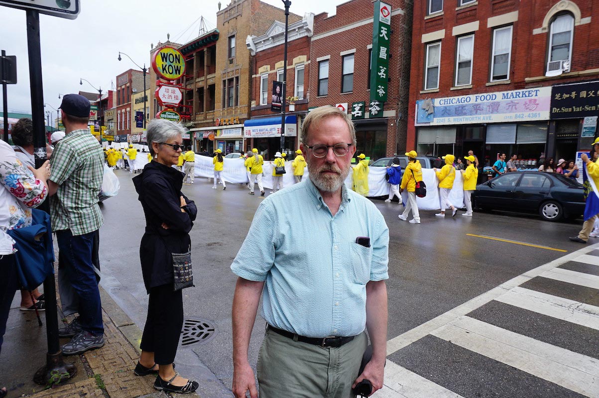 印第安纳州圣玛丽学院的政治系主任贝兰杰(Marc Belanger)也被游行吸引住了。他和太太带着几名学生到中国城用餐。当看到法轮功游行队伍路过,他驻足向学生们解释起来。