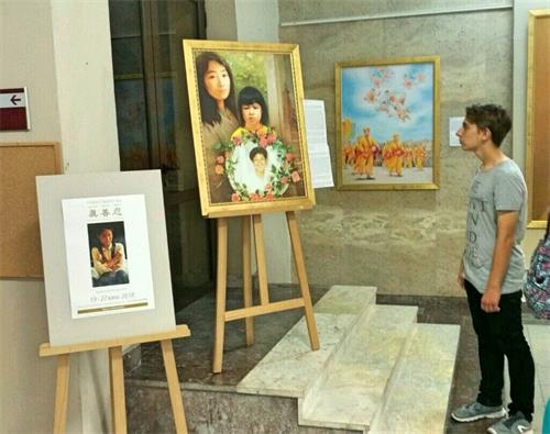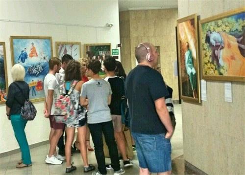 图1~4:二零一八年七月十九日至二十七日,“真善忍国际美展”在这里的图书馆Zacharyi Knyajevski举办,许多当地民众前来观赏,从而了解到法轮功及其中共对法轮功的迫害