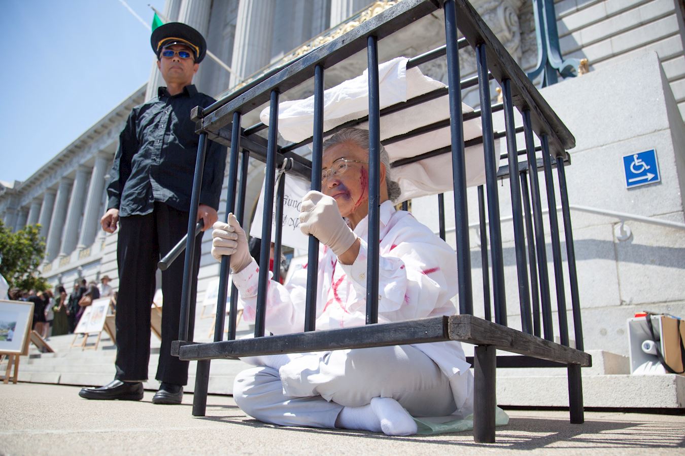 ![]() 图1~3:法轮功学员在旧金山市府前举办反酷刑展 |
