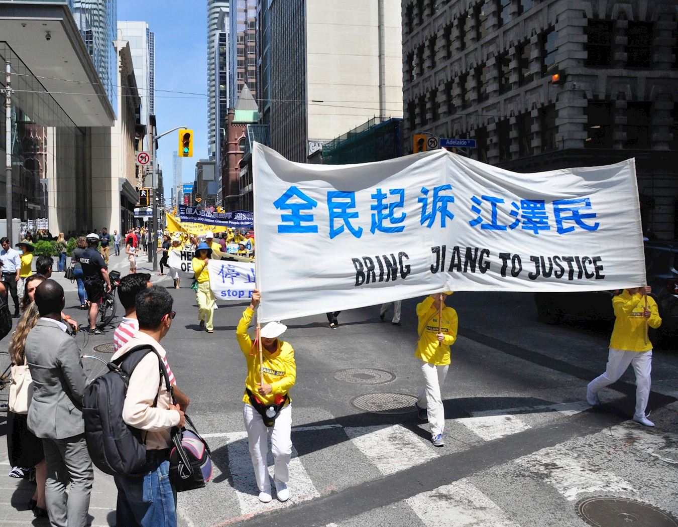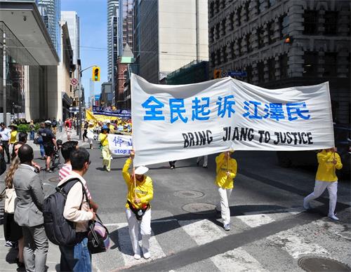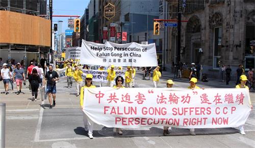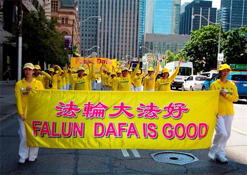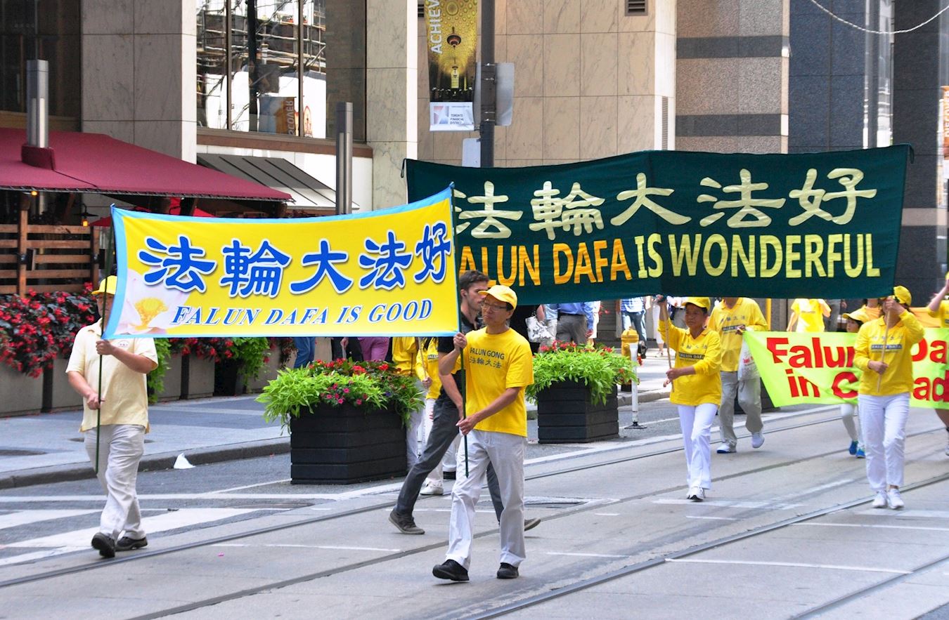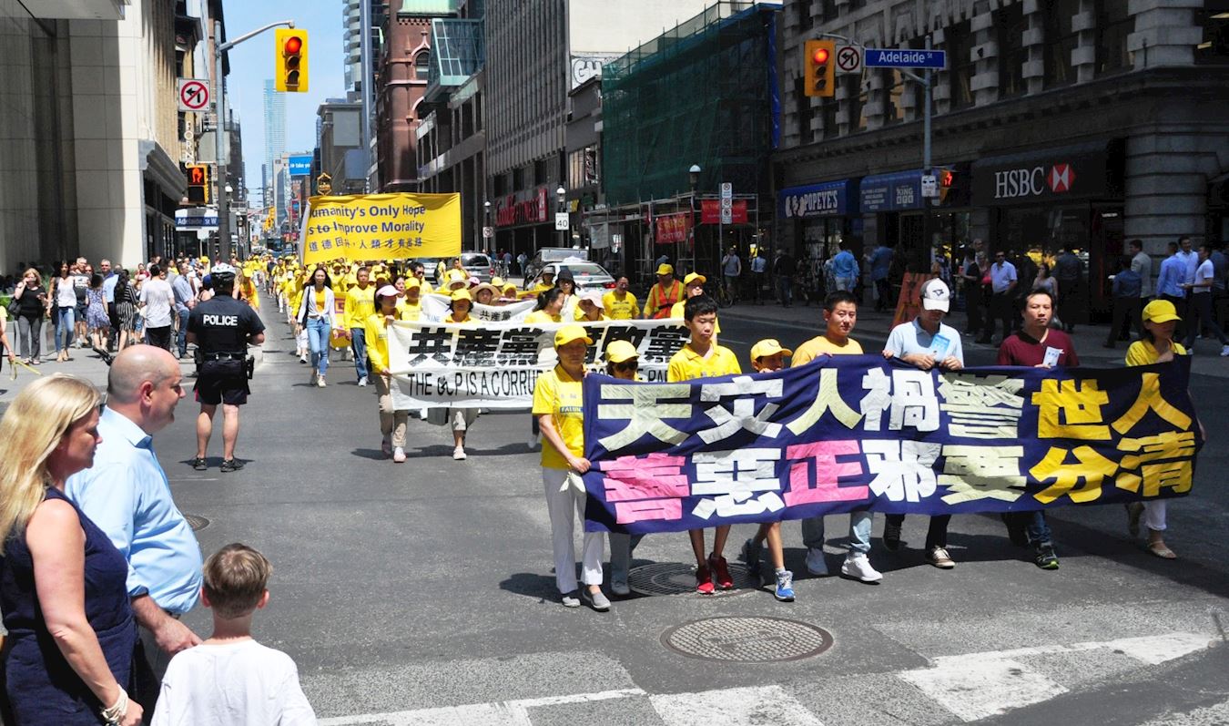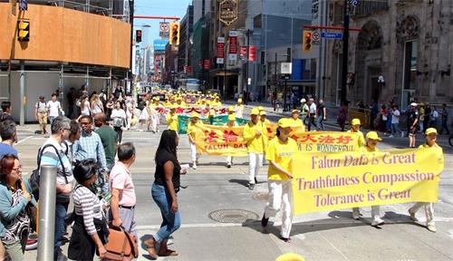 当天中午十二点,游行队伍从市政府广场出发,在多伦多商业大楼林立的金融中心行进,正值午餐时间,街道上有很多上班族和过往行人,看到游行队伍经过,他们纷纷拿出手机拍照和录像。有观众感慨为什么这么好的一个团体会被迫害这么长时间?!有观众流着泪说我不知道法轮功学员是怎么样面对如此残酷的迫害,我真想帮他们。第一次知道法轮功信息的观众感谢游行给他们带来了这个真相;做了三:退.的华人感谢法轮功。