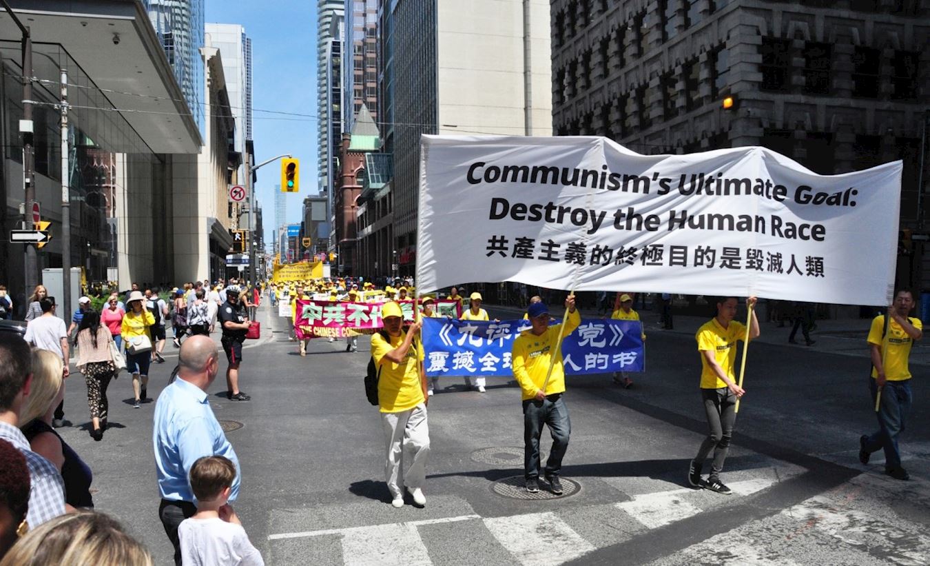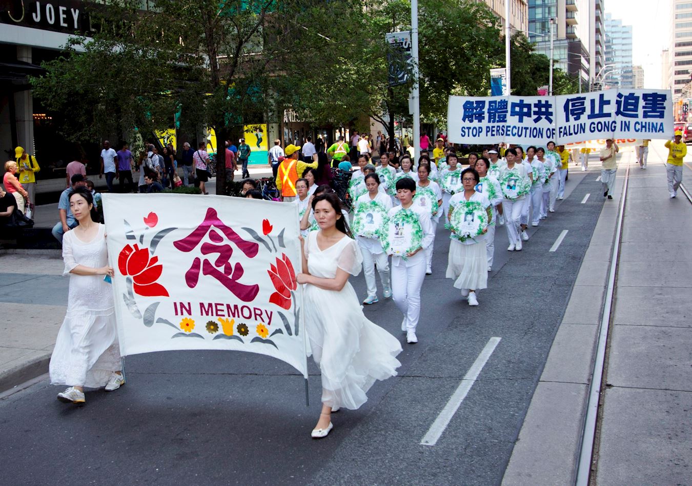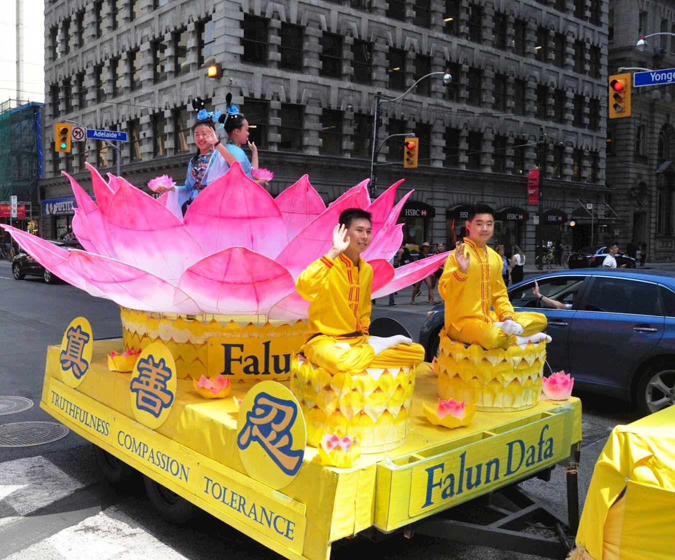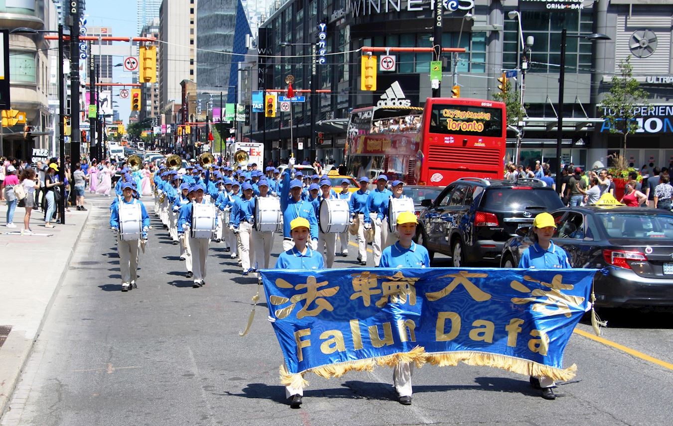 当天中午十二点,游行队伍从市政府广场出发,在多伦多商业大楼林立的金融中心行进,正值午餐时间,街道上有很多上班族和过往行人,看到游行队伍经过,他们纷纷拿出手机拍照和录像。有观众感慨为什么这么好的一个团体会被迫害这么长时间?!有观众流着泪说我不知道法轮功学员是怎么样面对如此残酷的迫害,我真想帮他们。第一次知道法轮功信息的观众感谢游行给他们带来了这个真相;做了三:退.的华人感谢法轮功。