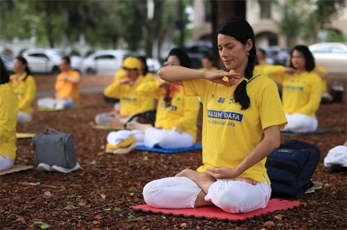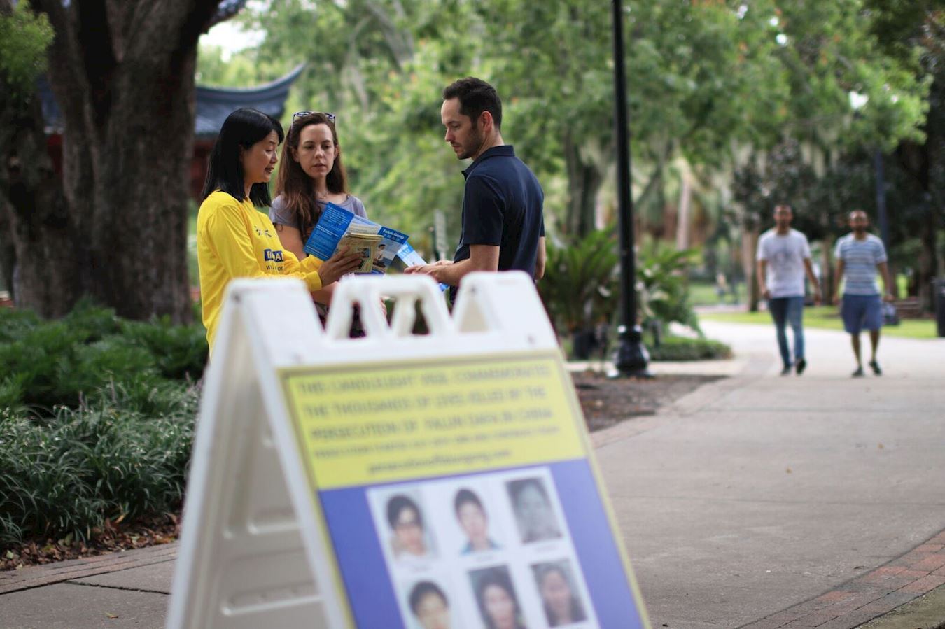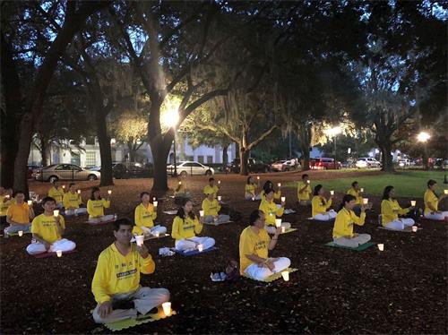 在烛光悼念之前,佛州法轮功学员进行了炼功和讲真相活动,安详的炼功场面和优雅整齐的动作,吸引许多来往公园的民众驻足关注,了解什么是法轮功和中共对法轮功的迫害及活摘法轮功学员器官的真相。
