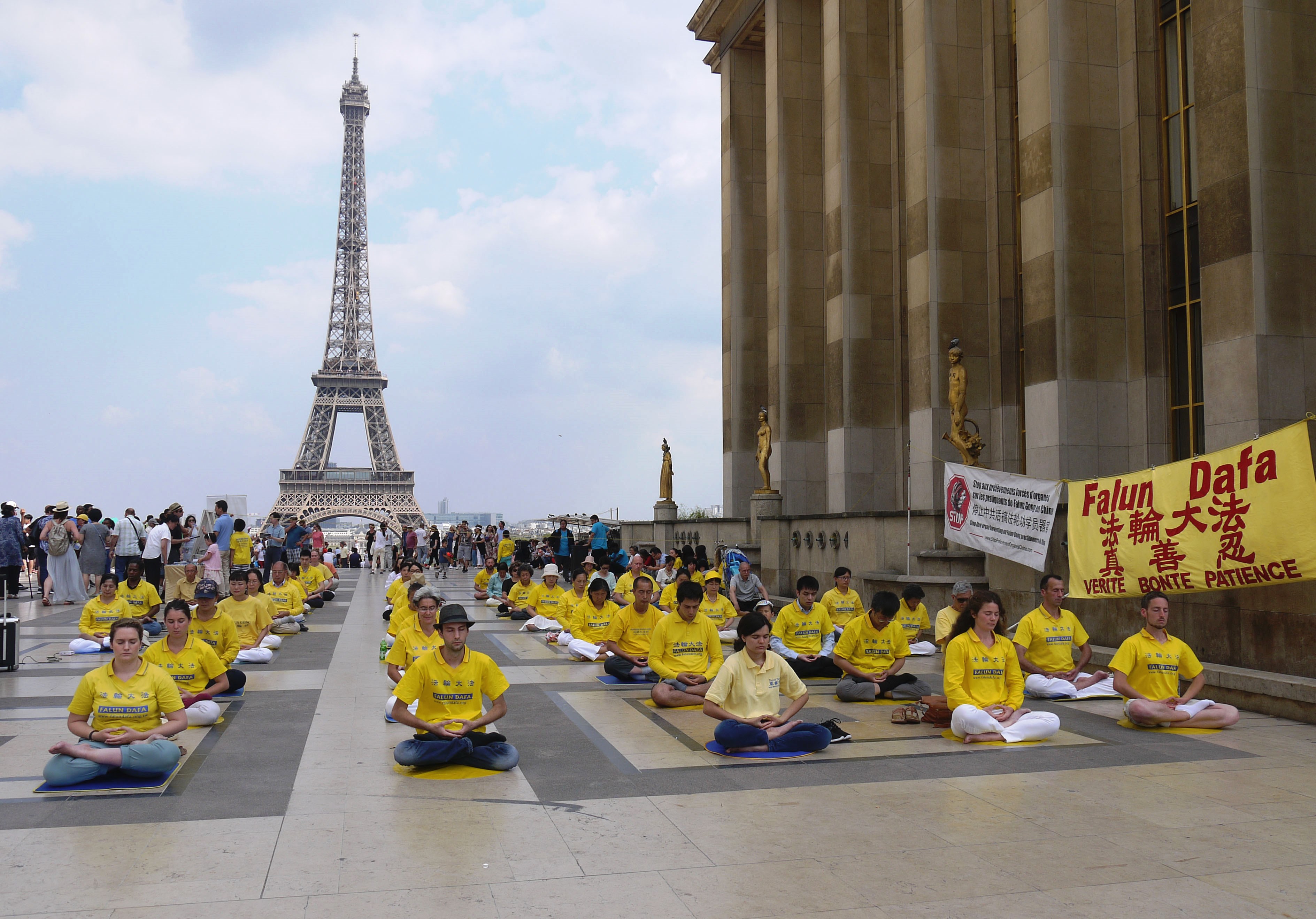 当天下午,在人权广场上,来自世界各地的游人和法国民众络绎不绝。他们或观看法轮功学员的功法演示,或阅读真相展板,或与法轮功学员交谈,了解真相。人们被宁静、祥和的法轮功功法吸引,被中共残酷的迫害震惊,他们不理解,为什么信仰真善忍会遭到迫害。人们纷纷在制止迫害征签表上签名。
