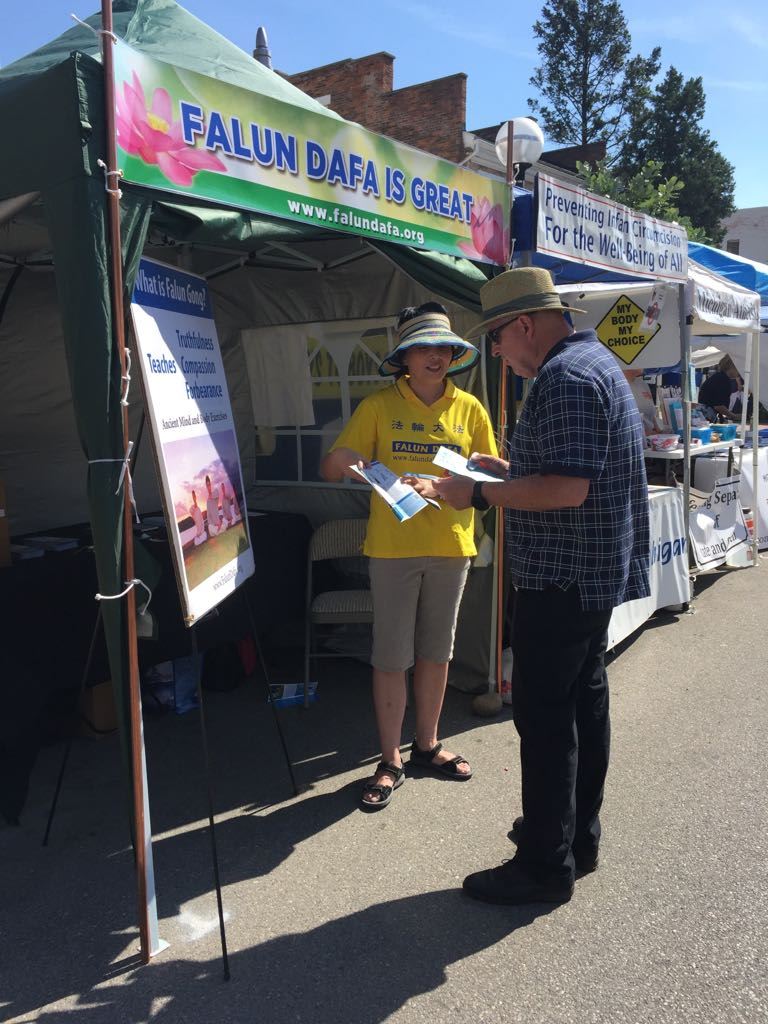和往年一样,人们再一次在安娜堡夏季艺术博览会上喜遇法轮功的展位,他们纷纷接过法轮功学员递过来的传单,并驻足与学员交谈。当他们听到法轮功是性命双修的古老功法(Ancient Mind and Body Exercise)时,很多人眼睛一亮,立即表示愿意学炼。“哪里有炼功点?”成了最常听到的问题。