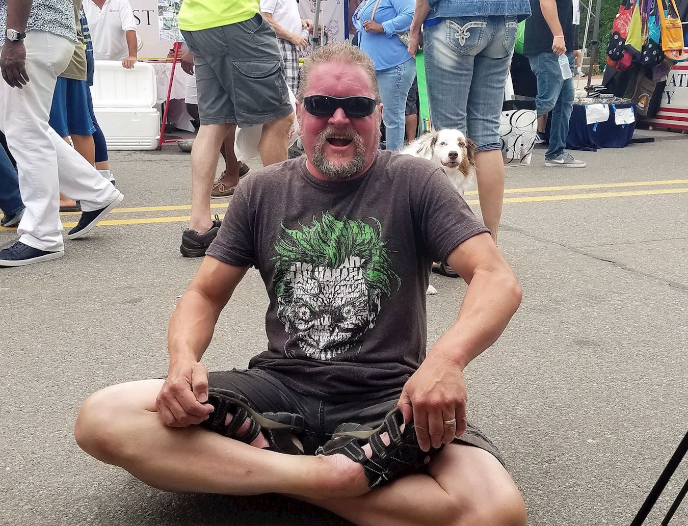 一名壮汉径直走到法轮功展位,询问什么是法轮大法,得到答复并知道了炼功点后说:“每个周日九点在盖洛普公园(Gallup Park)炼功是吧。肯定去!”当他仔细看了看展板上的打坐照片,立即就想学,一眨眼功夫他就坐在地上,用手把双脚按照展板上的打坐姿势,搬起来做了个双盘腿的动作,一边自豪地喊道:“我从来没有练过其他的,但我可以做这个(双盘)!(I can do this.)”
