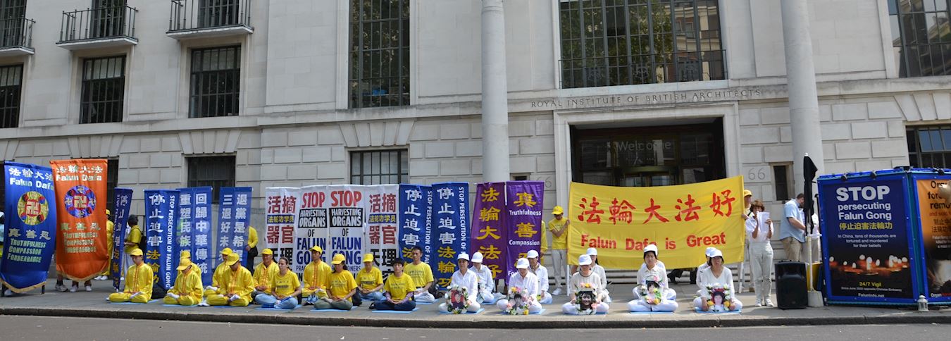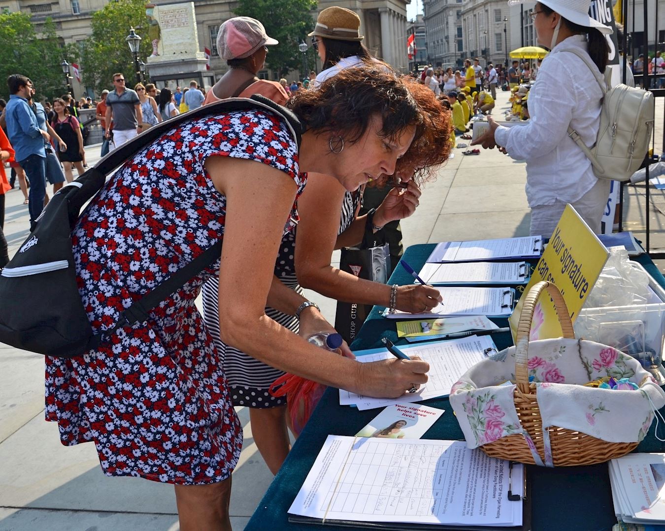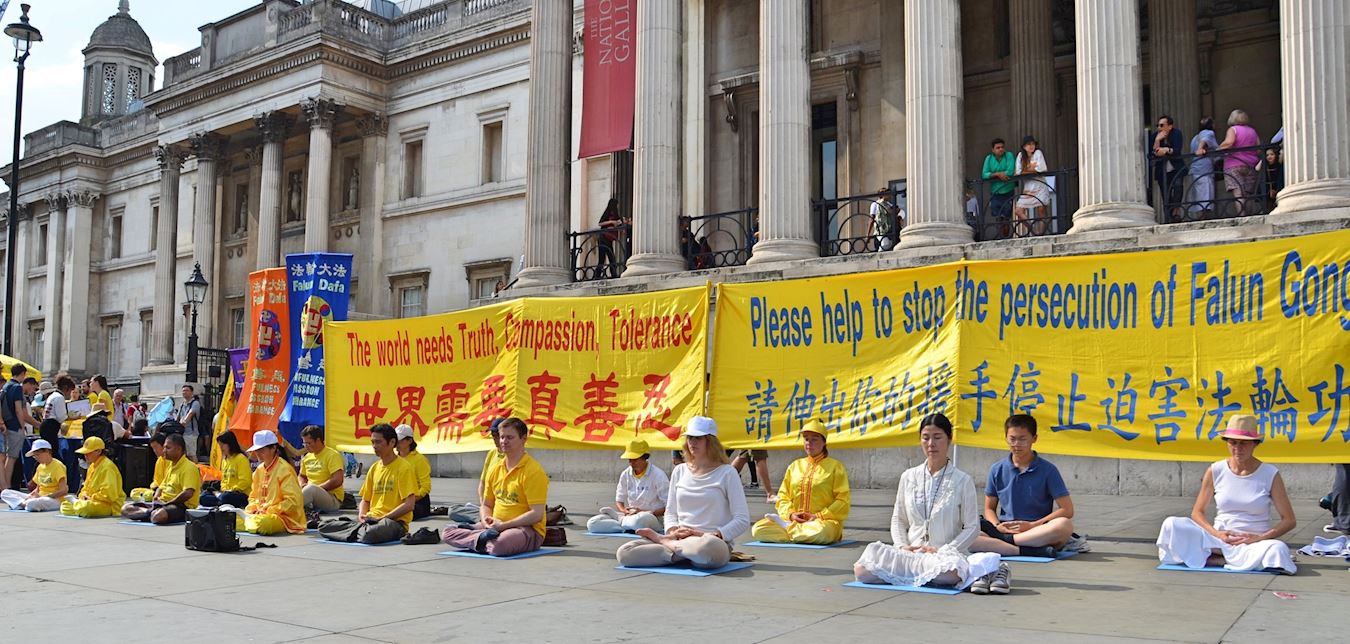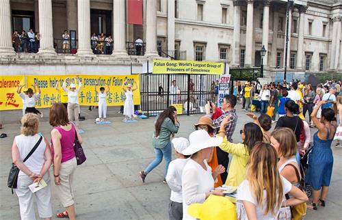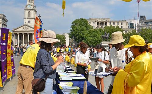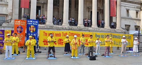 中午,法轮功学员从中使馆前出发在伦敦市中心举行了大游行。下午和晚间,法轮功学员在特拉法加广场举行了讲真相活动。