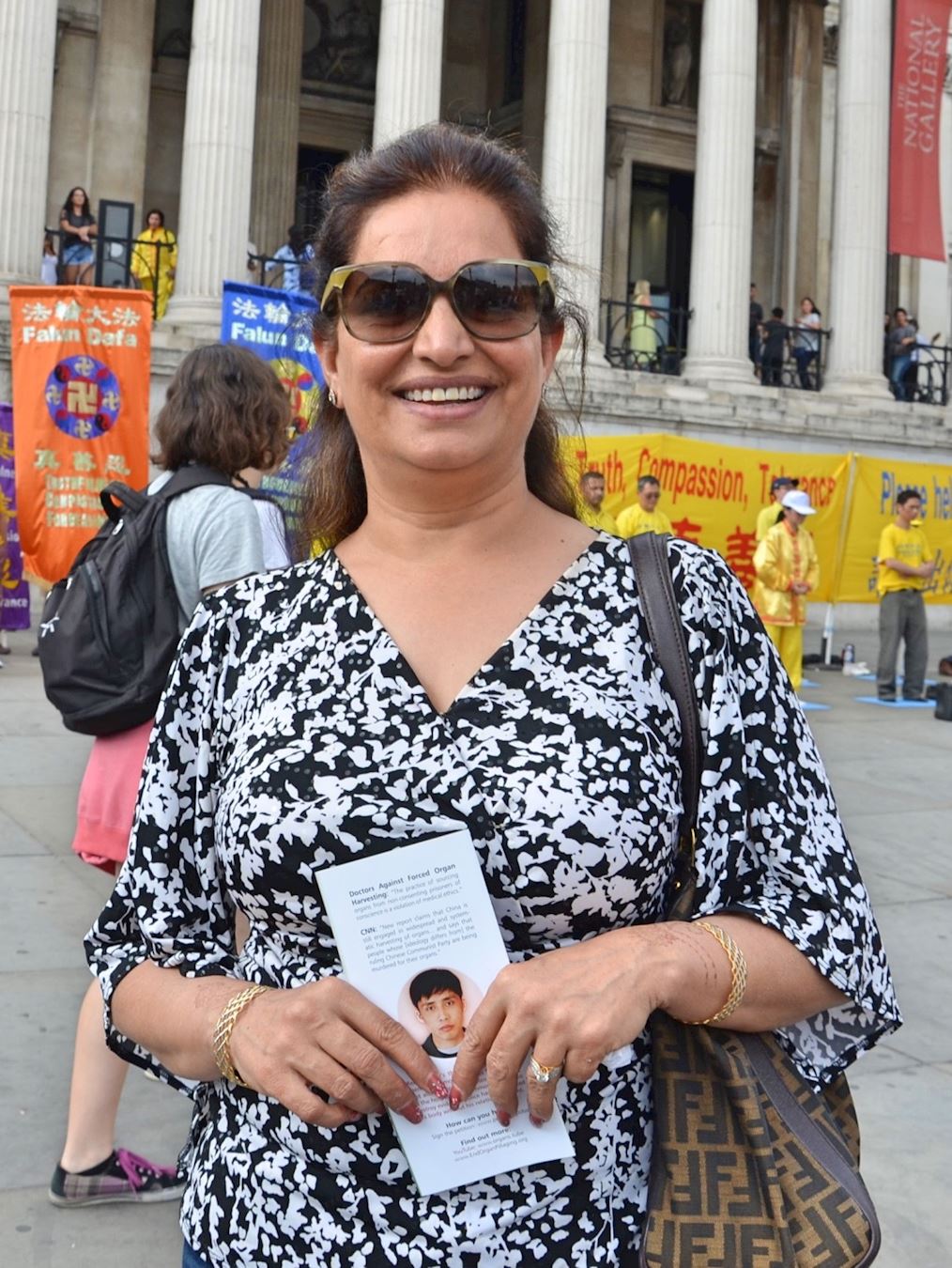 来自印度的碧霞·帕蒂娅(Beyush Bhadia)在征签表上签名支持法轮功学员反迫害。“我百分之百的支持他们(法轮功学员)。”她说。