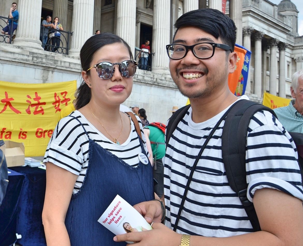 身怀六甲的璀(Thuy)来自越南,她和来自菲律宾的詹姆斯(James)在呼吁对发生在中国的迫害展开独立调查并制止迫害的征签表上签名后表示,他们以前在中国城看到过法轮功学员举办活动。今天再次看到,就走过来签名。璀说:“越多人签名越能帮助制止对这些人(法轮功学员)的迫害,所以我们就过来签名了。希望签名能带来改变。”