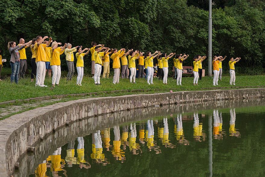 ![]() 图1:部份俄罗斯法轮功学员在莫斯科中领馆对面,集体炼功 |