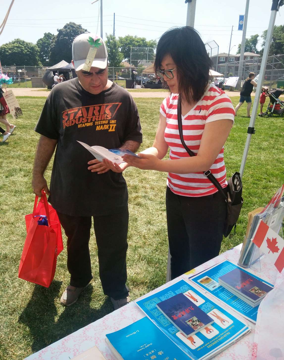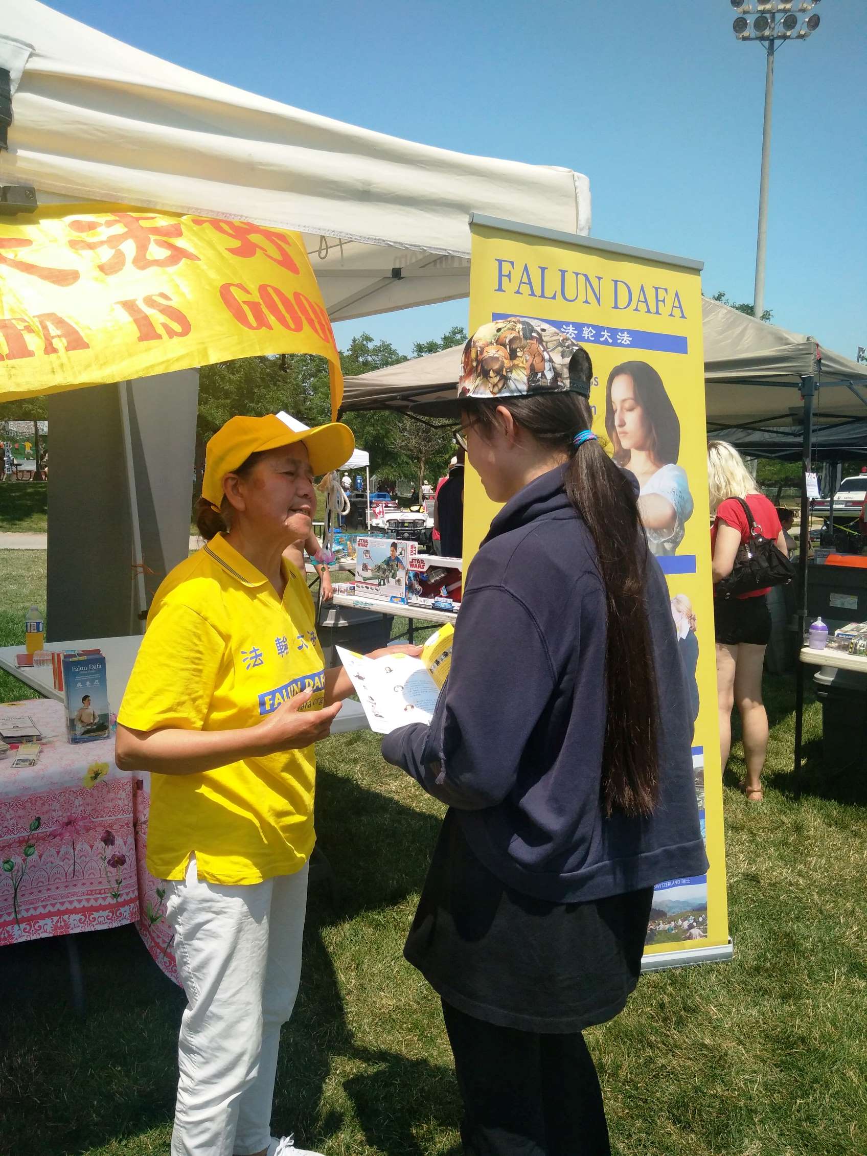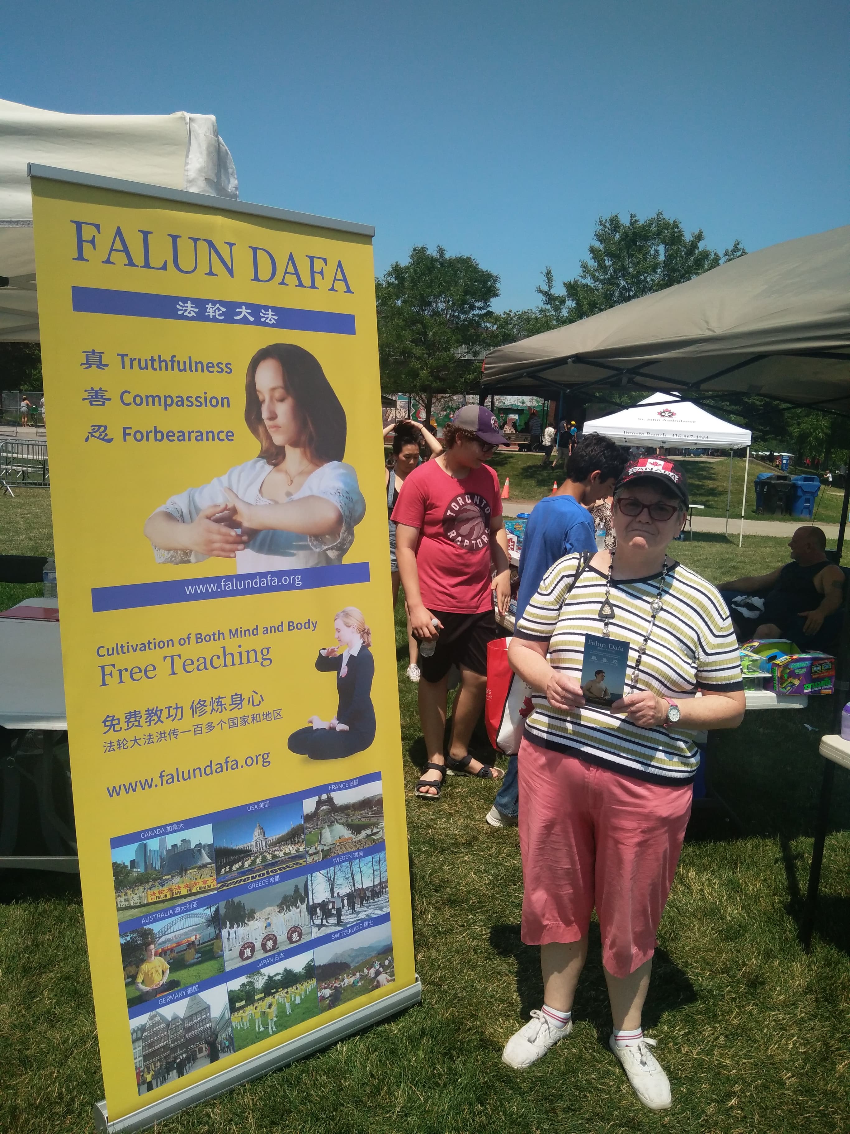 多伦多居民贝蒂(Batty)女士听完法轮功学员的介绍,表示“我非常需要这种修炼方法”。她留下了联系方式,希望学炼法轮功。