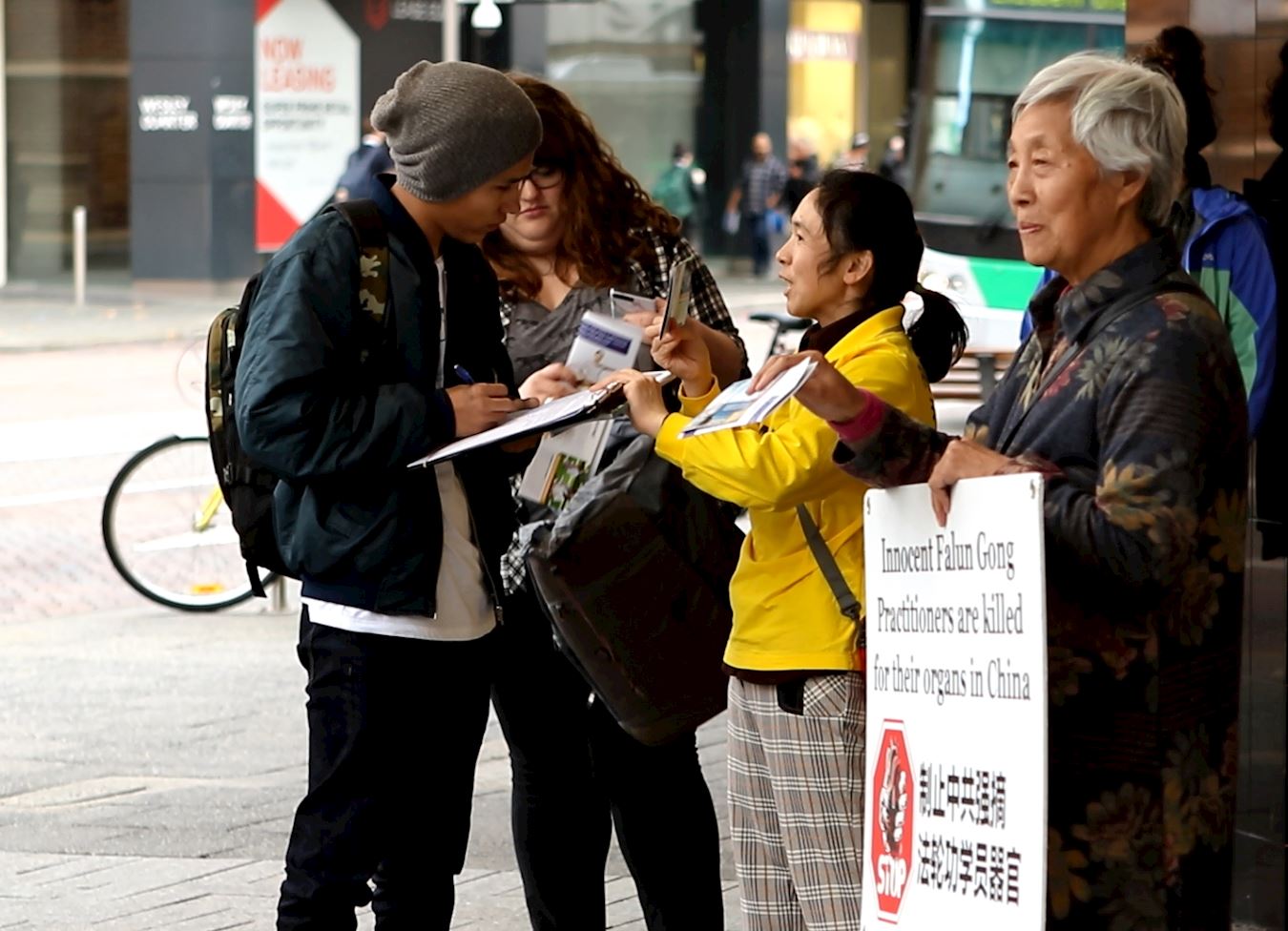 据明慧网报道,在过去的十九年中,经核实至少有四千二百三十六名有名有姓的法轮功学员被迫害致死。大量证据显示,中国存在着一个隐蔽的大型活体器官供体库用于器官移植,而这一庞大的供体群大多来自于被非法关押的法轮功学员。为了帮助当地民众进一步了解中共活摘法轮功学员器官等迫害真相,活动当天,法轮功学员从清晨六点半直至傍晚,在圣乔治大街(St Georges Terrace)上展开横幅,并向过路民众展示功法、发真相传单、征集反活摘签名等。上下班民众路过横幅都会放慢脚步,或驻足阅读横幅上的内容,或询问法轮功的具体情况,并签名支持法轮功和平理性反迫害。