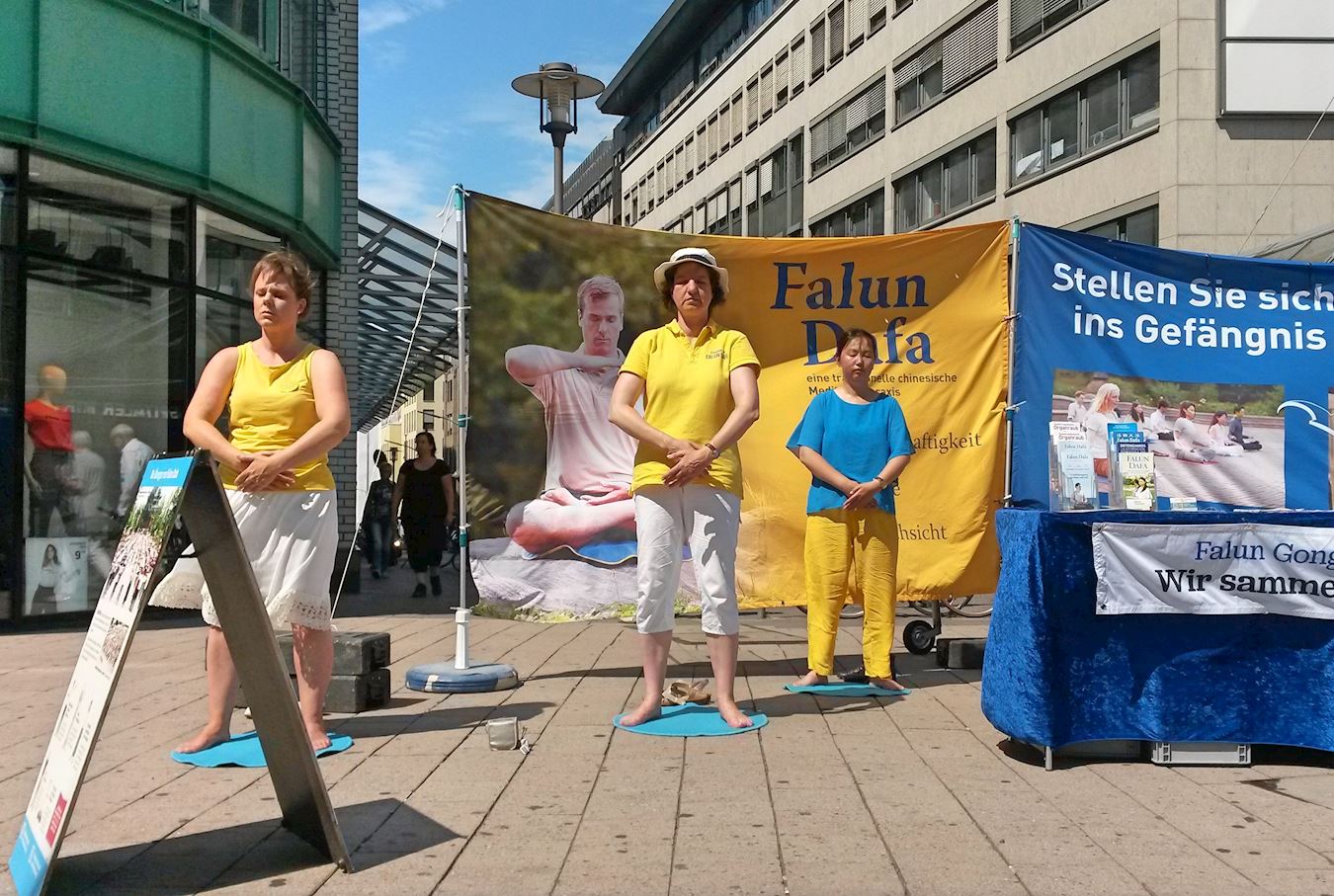 '图1:二零一八年七月二十八日中午,法轮功学员在在汉堡市中心的步行街史比塔勒街(Spitalerstrasse)上设立真相点,通过功法演示,展示大法的祥和与美好,同时揭露中共对法轮功学员的残酷迫害。'