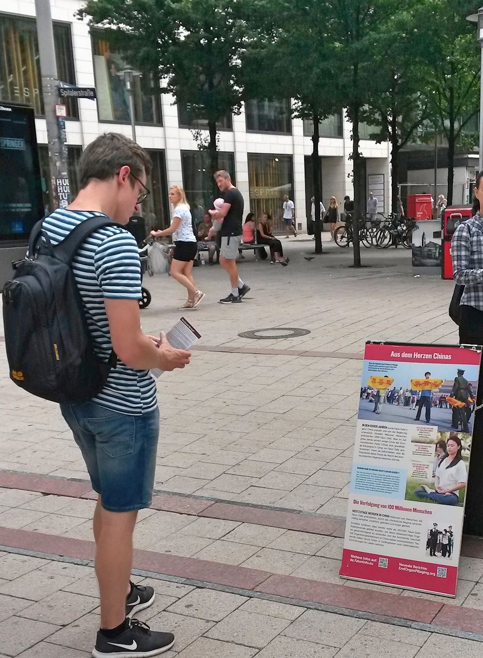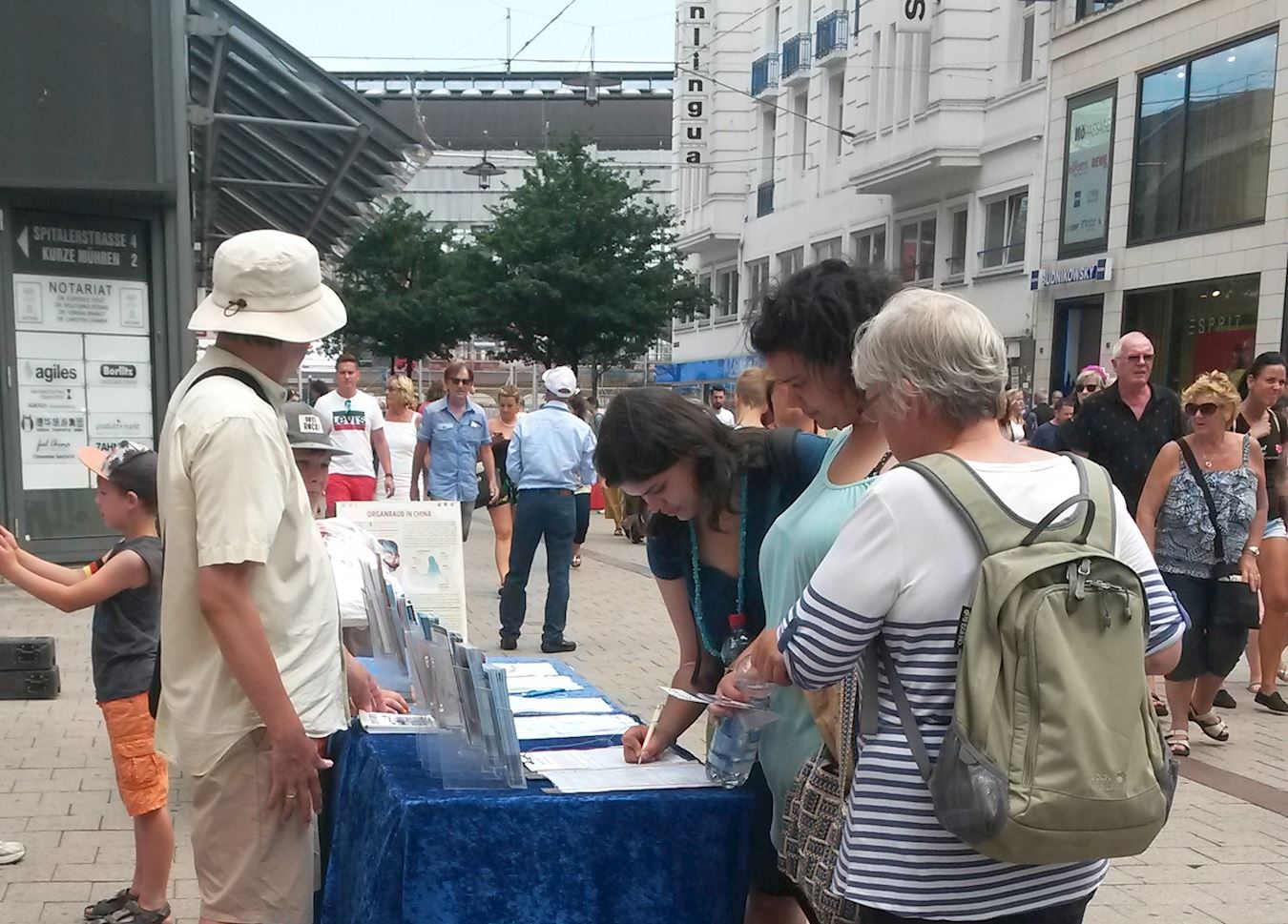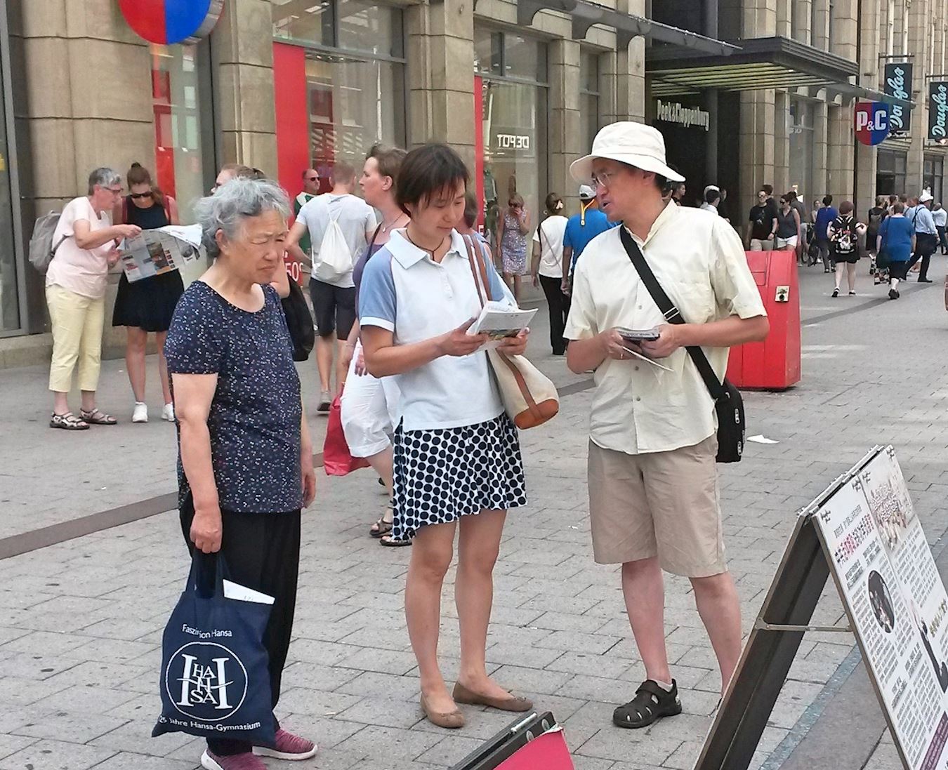 图1:二零一八年七月二十八日中午,法轮功学员在在汉堡市中心的步行街史比塔勒街(Spitalerstrasse)上设立真相点,通过功法演示,展示大法的祥和与美好,同时揭露中共对法轮功学员的残酷迫害。