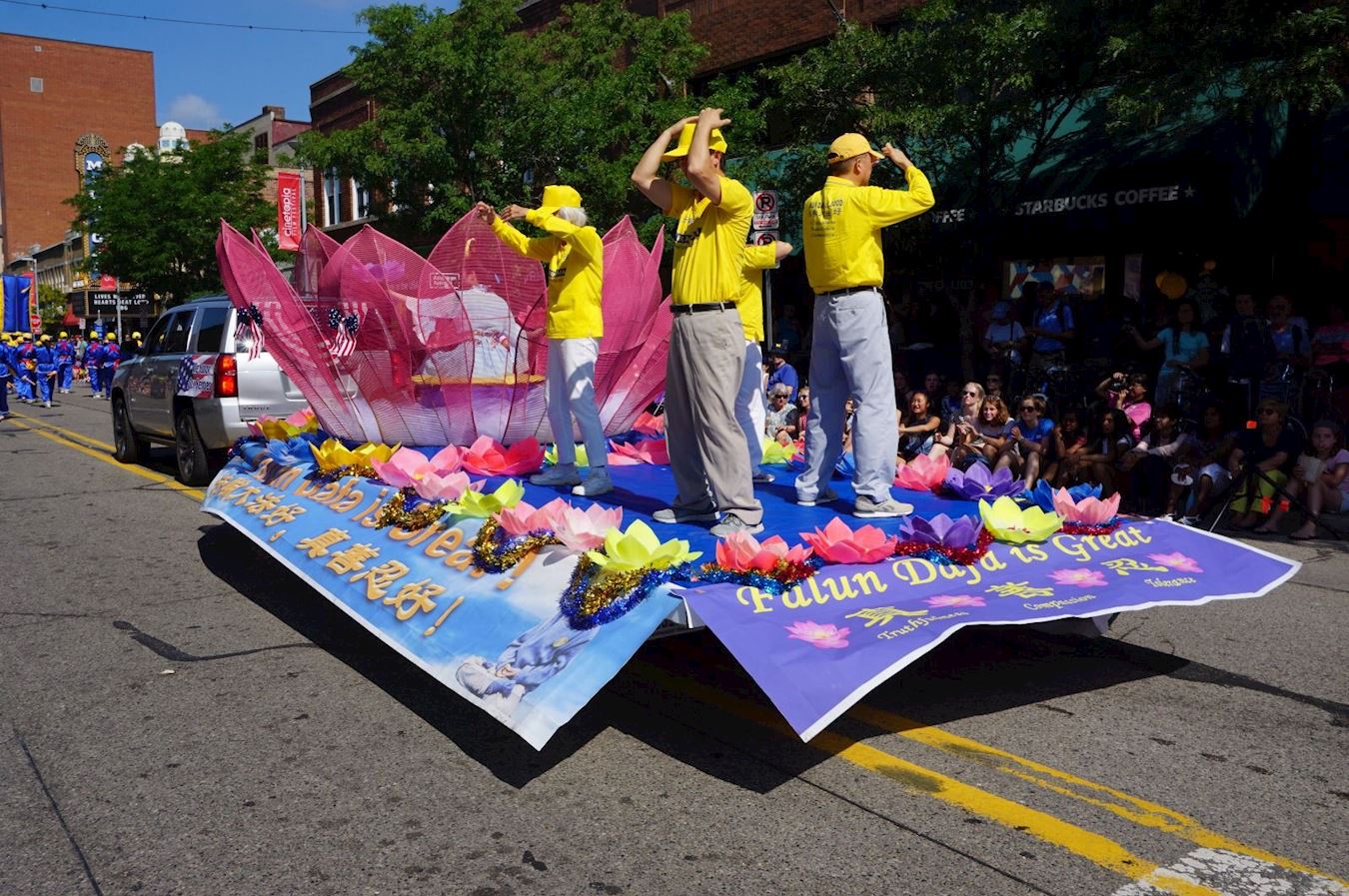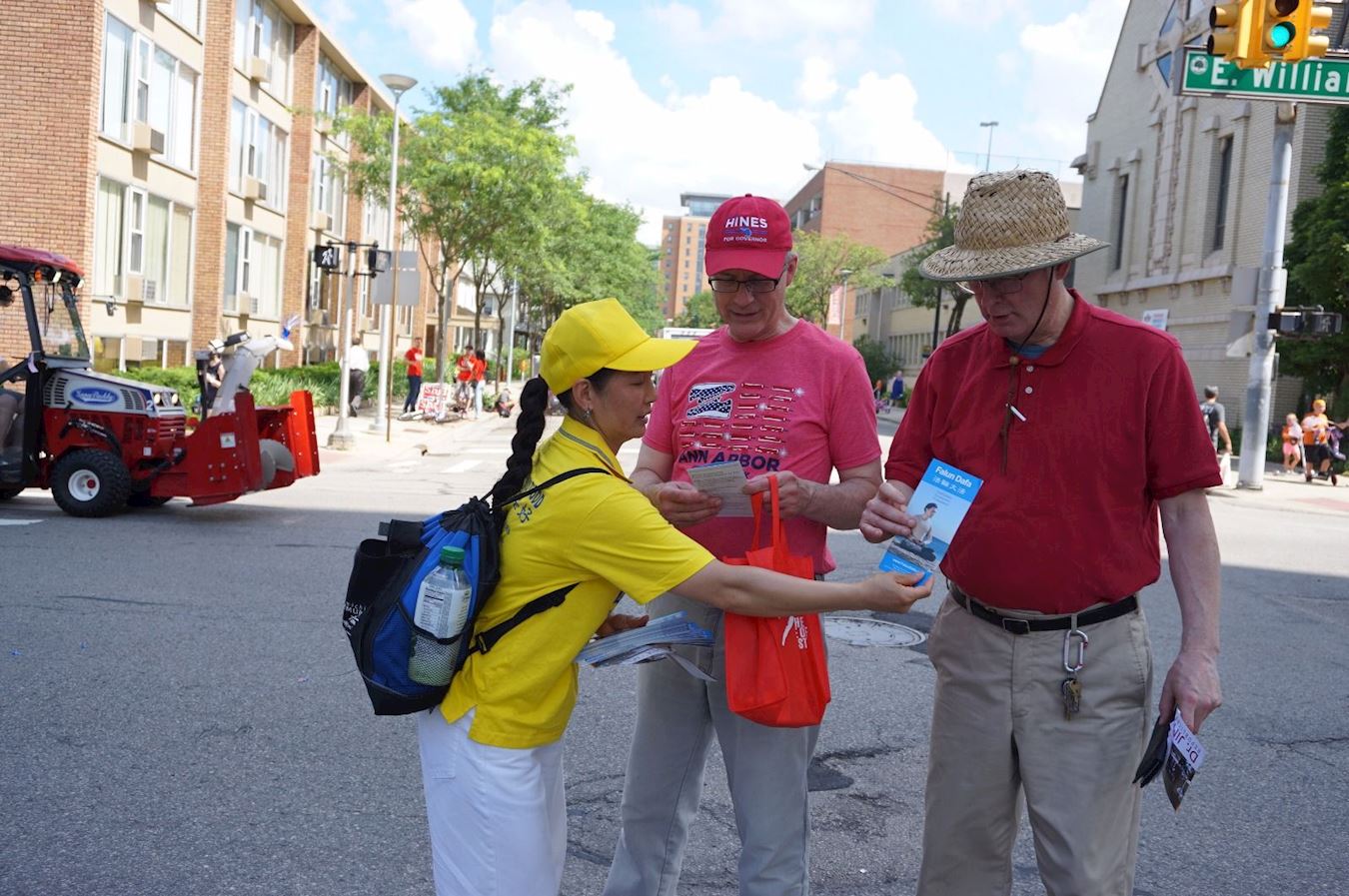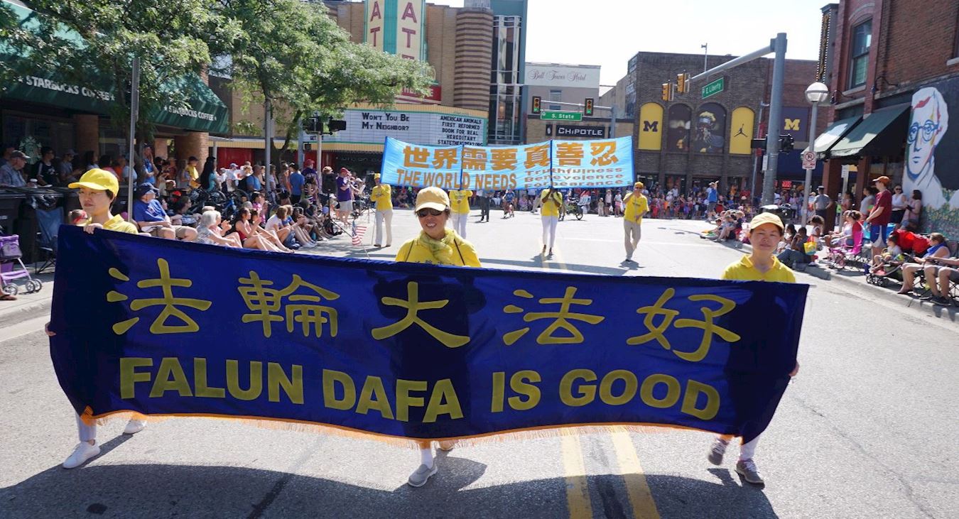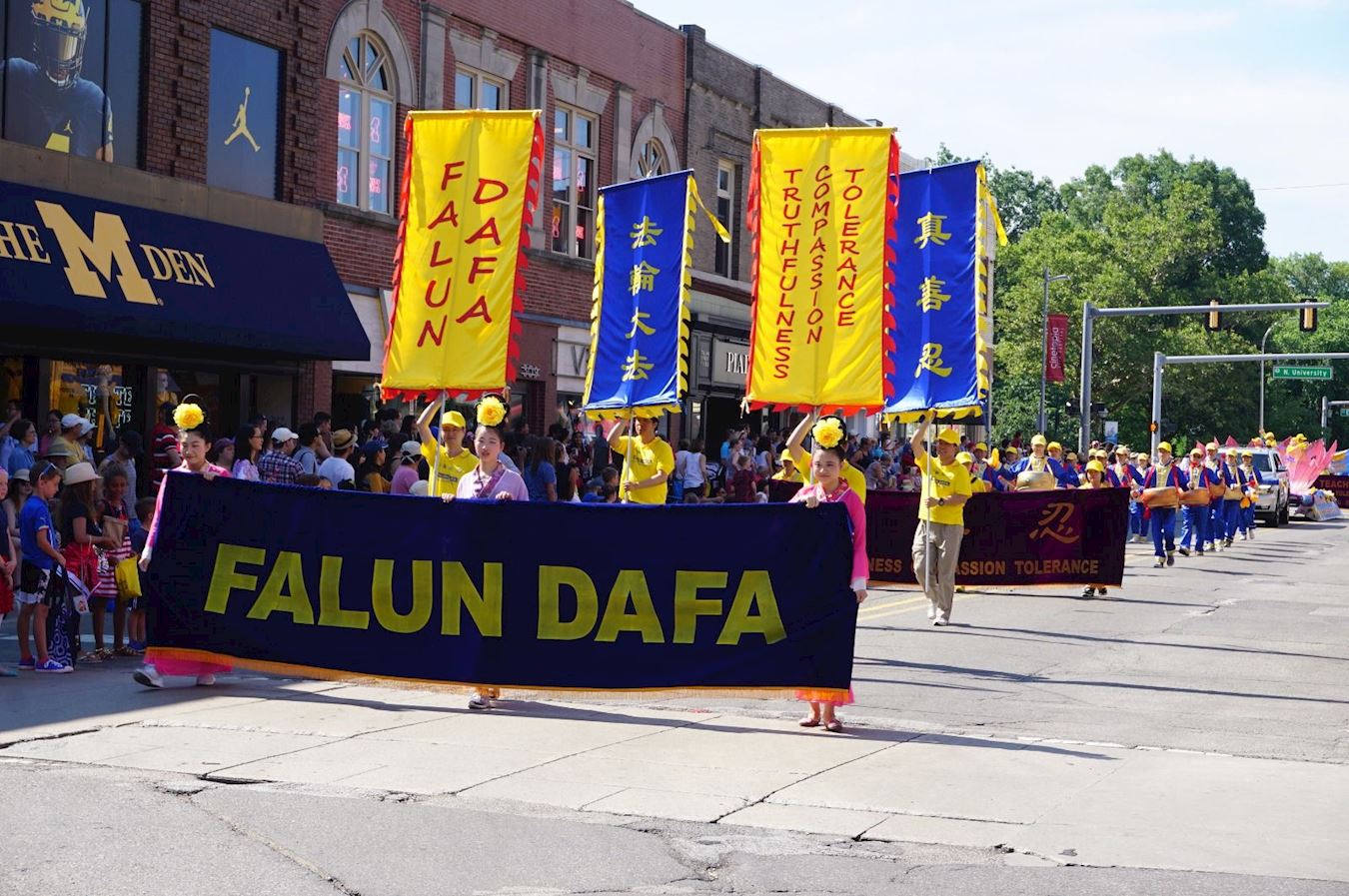 美国密西根州安娜堡市是一个具有195年历史的大学城,著名的密西根大学,友好的文化氛围,和优质的中小学等因素,让安娜堡市二零一七年再次登上Niche.com网站评选的美国最宜居城市榜(Best City to Live in America)第一名。为庆祝美国独立日国庆,由安娜堡青年商会(The Ann Arbor Jaycees)组织的密西根安娜堡独立日游行是夏日的重头戏,每年吸引着近百个社会团体参加,现场观众近万人。特别是近几年,优质的教育环境吸引了大批中国留学生,和华人居民。密西根州法轮大法学会再次应邀参加了国庆游行,把法轮大法的美好带进了大学城的居民。