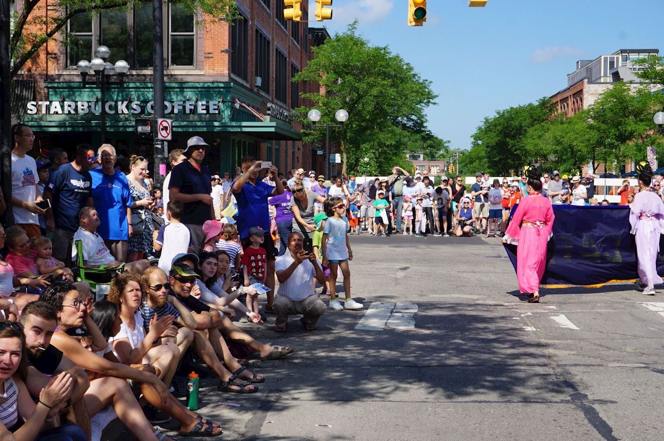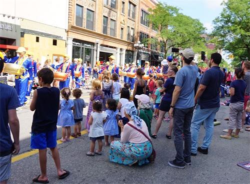 七月四日这天,天空清澈,艳阳高照。在安娜堡主街(Main Street)上,法轮功团体带来了巨大的粉红色莲花花车、五套优美祥和的功法展示、身着蓝黄相间的唐鼓阵、以及中英文的“世界需要真善忍”、“法轮大法好”等横幅。所到之处,无不受到两旁人群的欢迎,许多人合着法轮大法好的音乐拍手,或欢呼;华人观众纷纷拍下这个特殊而美丽的团体,很多华人对发资料的法轮功学员点头表示友好,并接过真相传单。