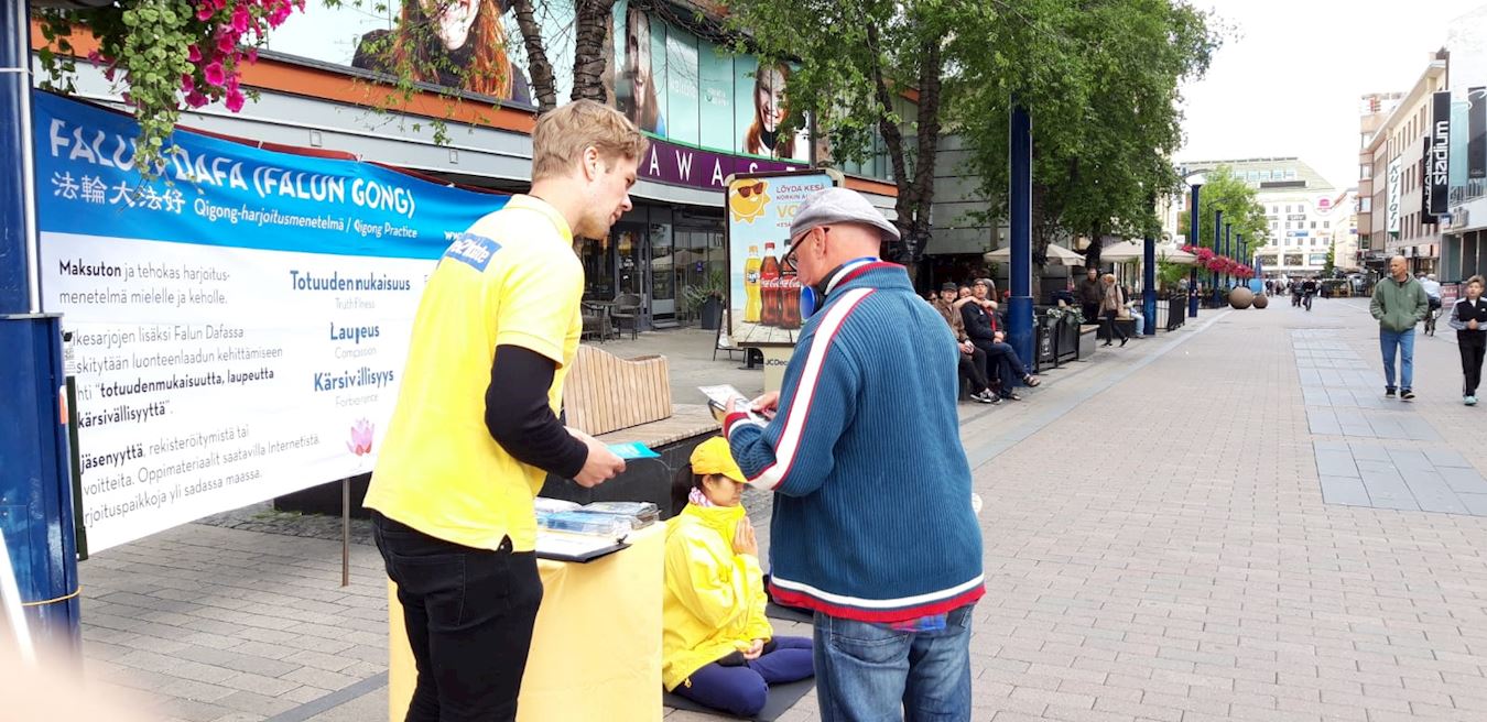 一位男士说两年前在首都赫尔辛基遇到过法轮功学员,他表示想再一次签名,要求中共停止迫害法轮功。