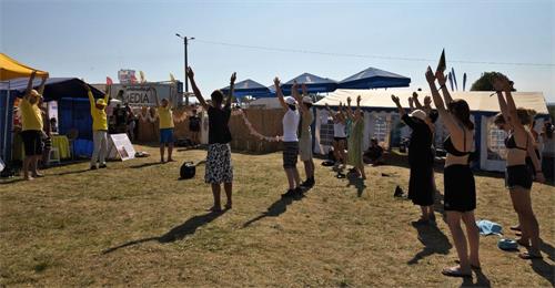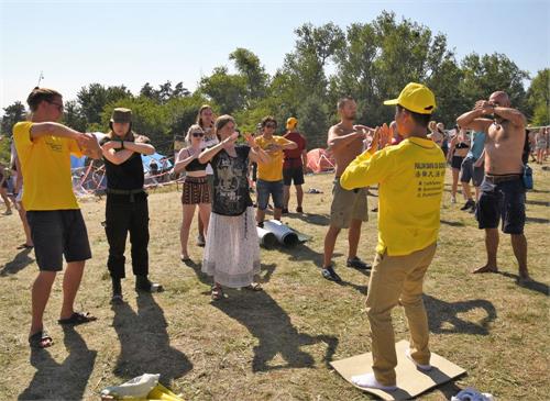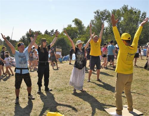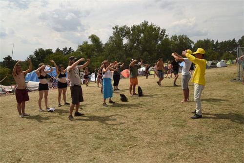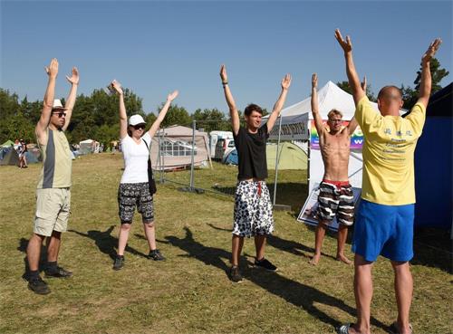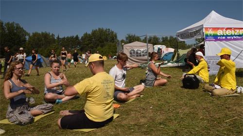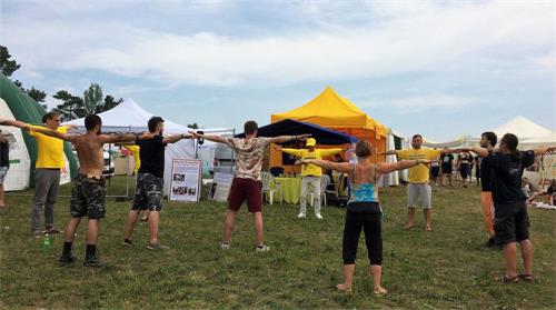 每当早晨法轮功学员来到法轮大法黄色帐篷前打开炼功音乐时,几分钟内学员的对面就会聚集很多学炼法轮功的年轻人;也有很多来自音乐节上举办各种活动的参展人员,他(她)们随着音乐认真做着动作,而且坚持学完五套功法。有人每天都来学炼法轮功,还有人一天之内几次反复来学功法,大家都说:“我们真的喜爱法轮功”。