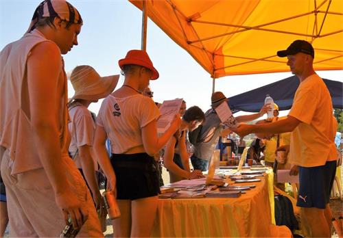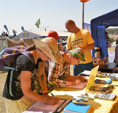 法轮功学员特别向在场的年轻人推荐学炼法轮功,推荐阅读《转法轮》,告诉他们这是了解中华文化的最快捷径,最重要的是那里有面对糟杂世界能够分清是非,保持清醒头脑的唯一标准。在场的年轻人纷纷接过法轮大法传单,并在“写给波兰议员的一封信”上签名,也在向中国“两高”控告江泽民的中文表格上签名。