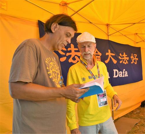 一位年轻的小伙子热情拥抱法轮功学员,大声说:“法轮大法太好了,是这个音乐节上最好的声音,也是我们波兰最好的声音,我要告诉所有人:法轮大法好!你们应该在帐篷上竖一面法轮大法旗帜,让大家都能容易找到你们,我可是找了好久才找到你们的。”