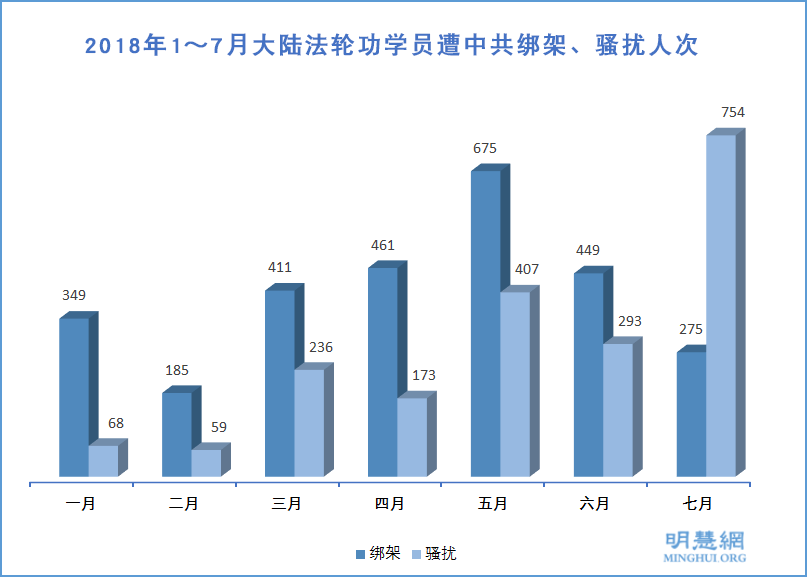 ![]() 图2:2018年1~7月大陆法轮功学员遭中共绑架、骚扰人次 |