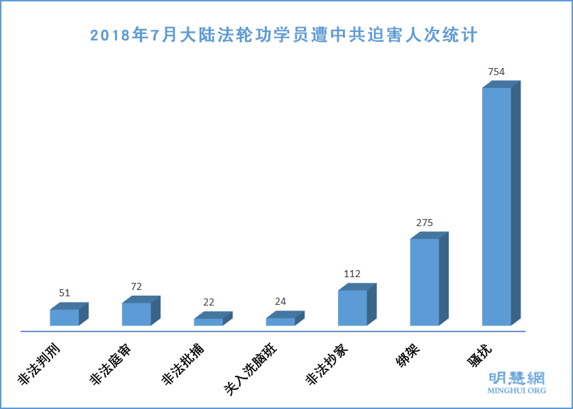 据明慧网信息统计,二零一八年七月份至少有275名法轮功学员被绑架,一人失踪,其中4人因控告江泽民被绑架,17人65岁以上,一人81岁;83人已回家。在七月份,法轮功学员有754人被骚扰,51人被非法判刑,72人被非法庭审,22人被非法批捕,24人被强行送洗脑班,112人被非法抄家,被敲诈勒索现金有据可查的达238690元,其中法院罚金151000元,警察抄家勒索87690元。