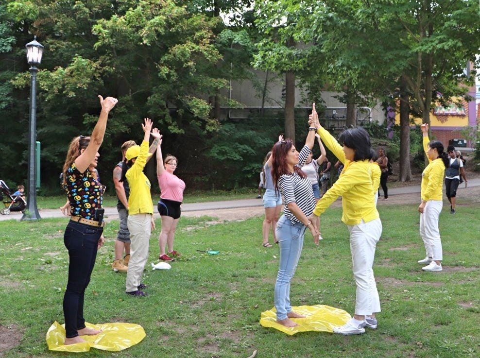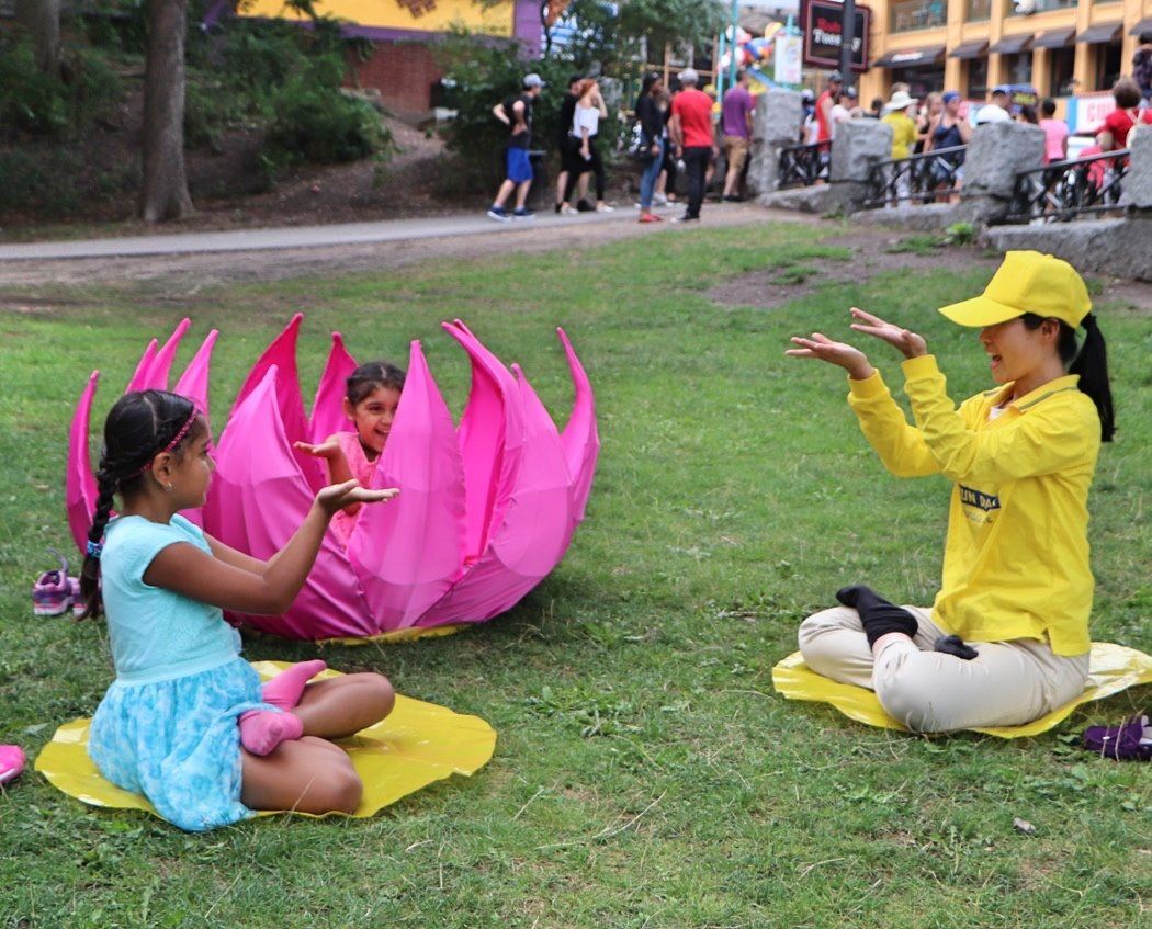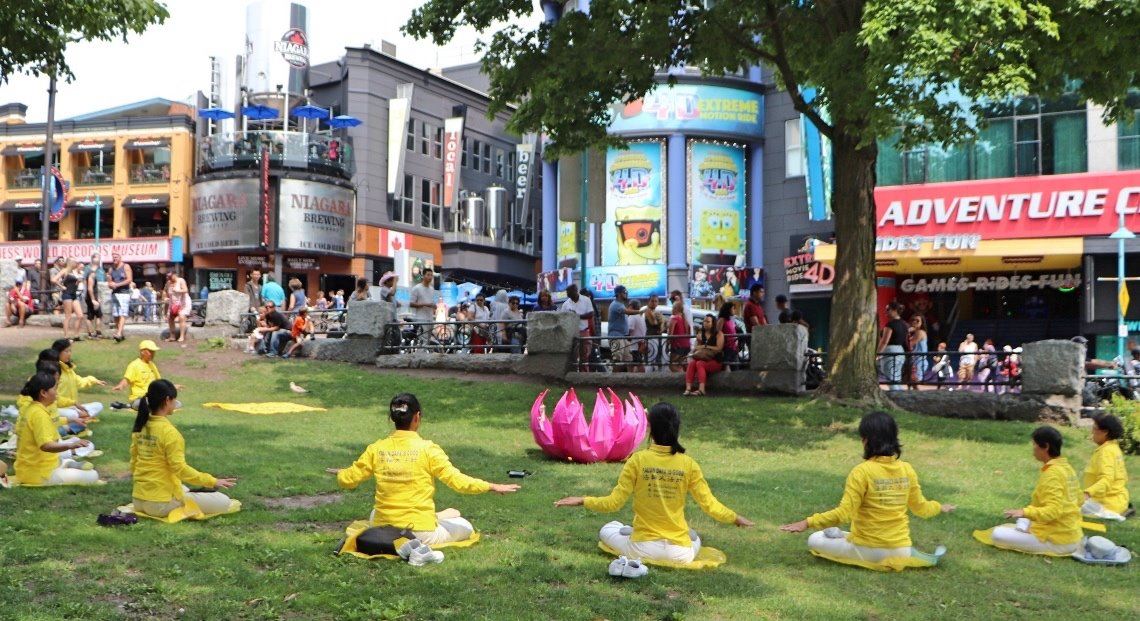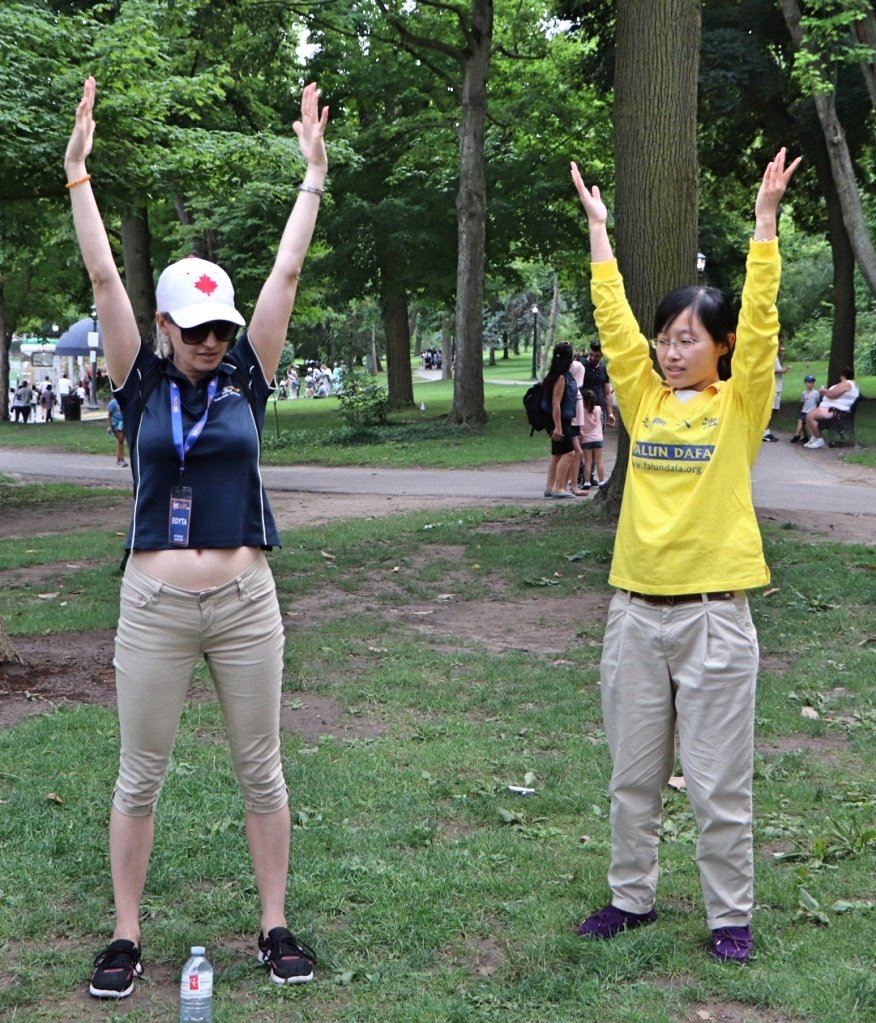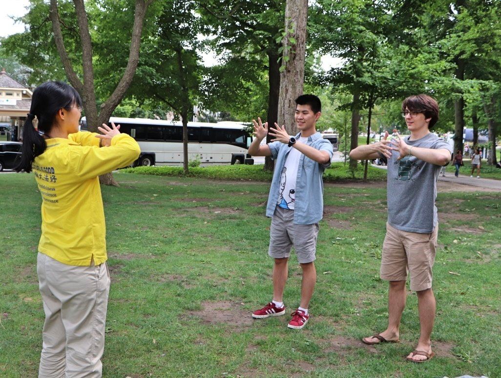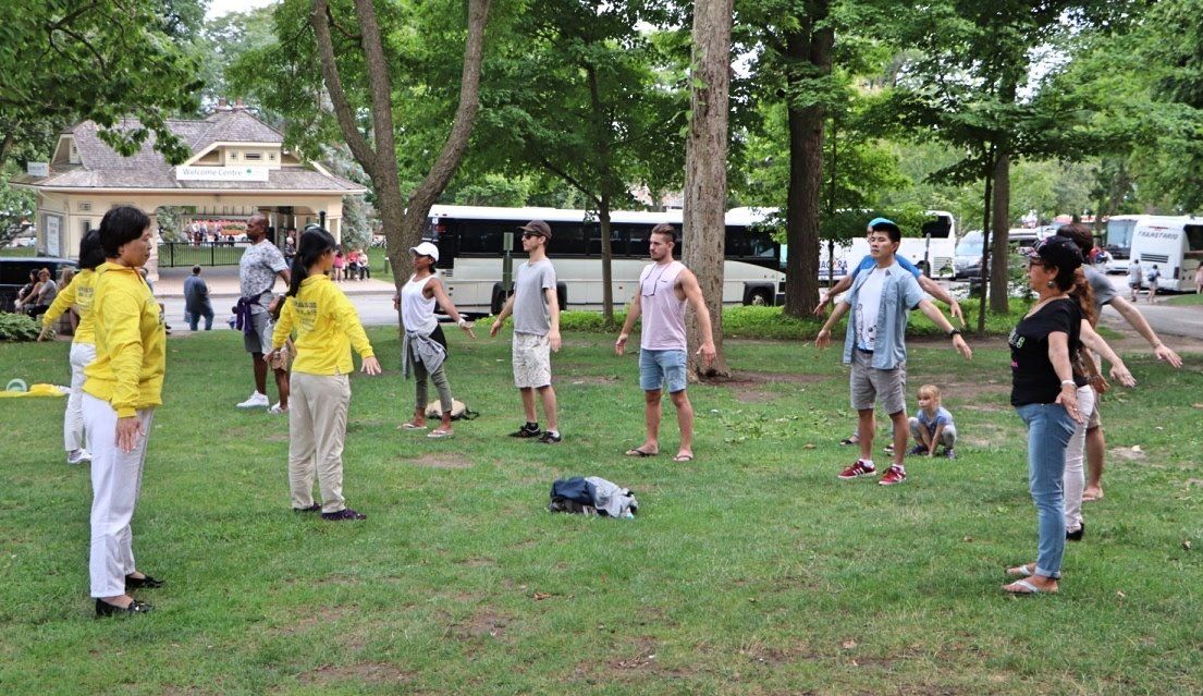 多伦多法轮功学员从今年七月开始,每个周六都有三、四辆车,从多伦多开一个半小时的路程来到这里给游客介绍法轮功,并义务教功,游客们踊跃学法轮功功法。学完功法后,他们纷纷感谢法轮功学员。