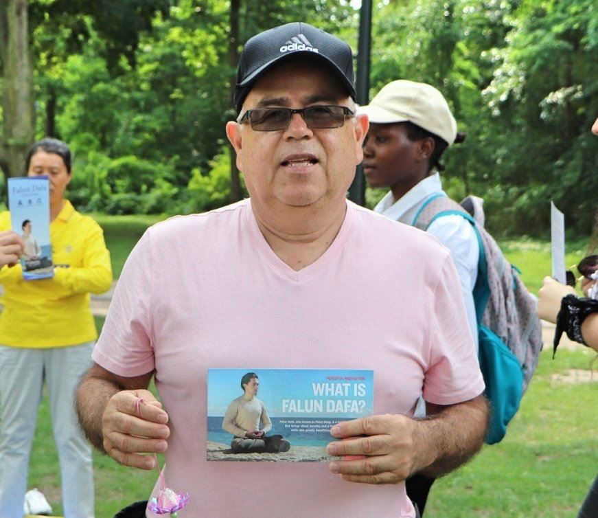 从智利(Chile)移民到美国三十年的古斯塔沃(Gustavo)在美国经营一家小型公司,他在现场学完功后说:“工作压力太大了,精神有时会很紧张,需要放松,这个功法很好,我学完功后全身充满了能量。我还知道有西班牙语的《转法轮》,我回去一定要去找到。”