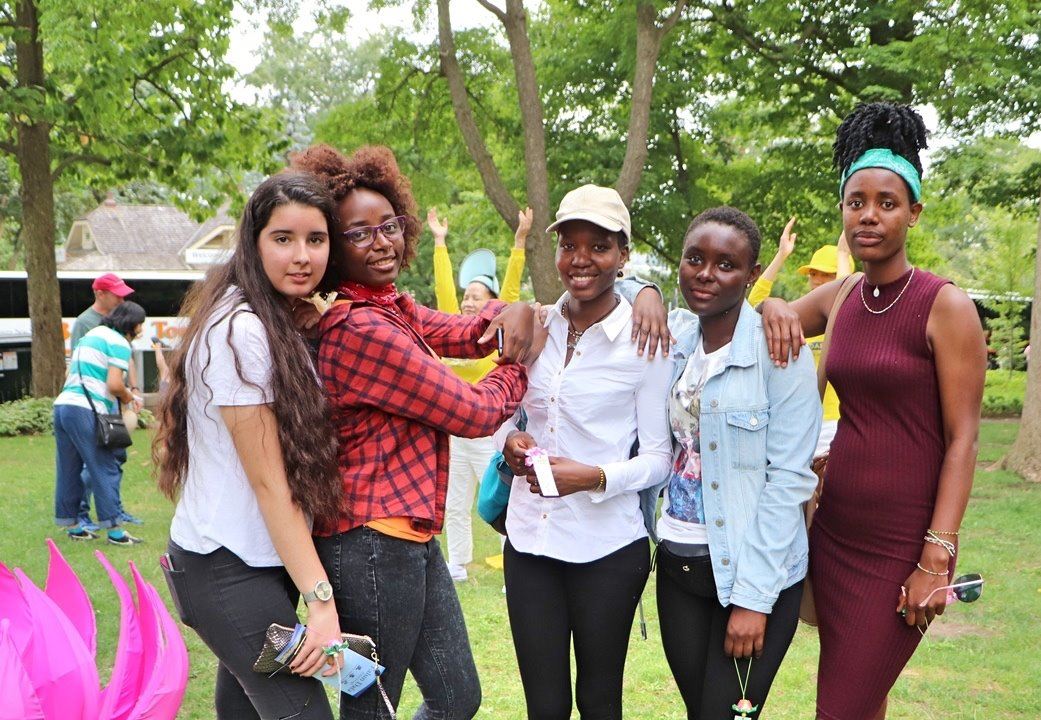 来自多伦多的法蒂玛(Fatima)和她的同学们一起参加了学校的夏令营,今天来到瀑布遇上法轮功学员义务教功,她们一直学了很长时间,当记者问她们感觉怎么样时,她们兴奋地一起说:“太好了!It's so good!”她们还一起学会了中文“法轮大法好!真善忍好!”