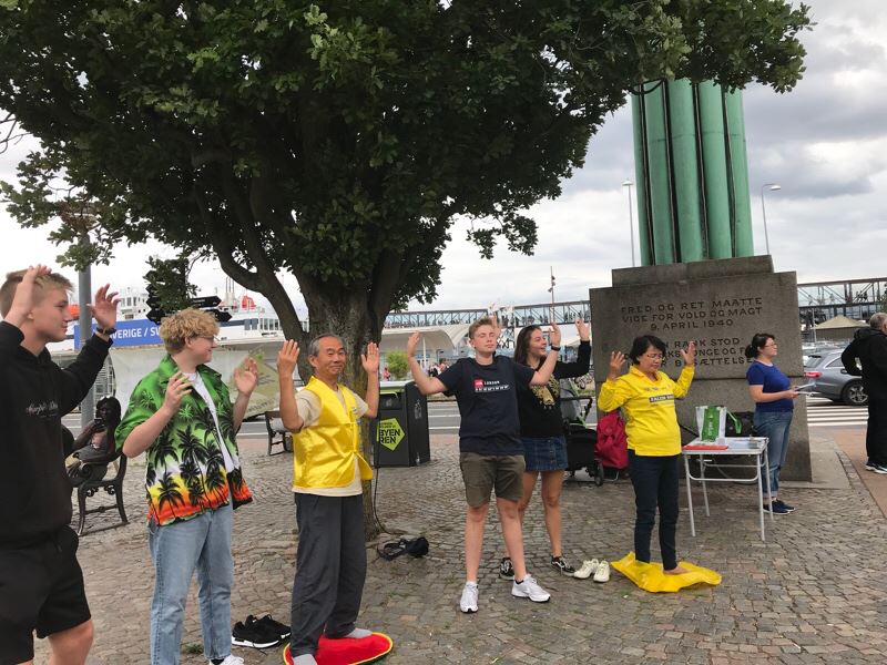 ![]() 图:一群赫尔辛格青年在象征和平和正义的“瑞典柱”Sveas?jlen塔旁学炼法轮功。 |