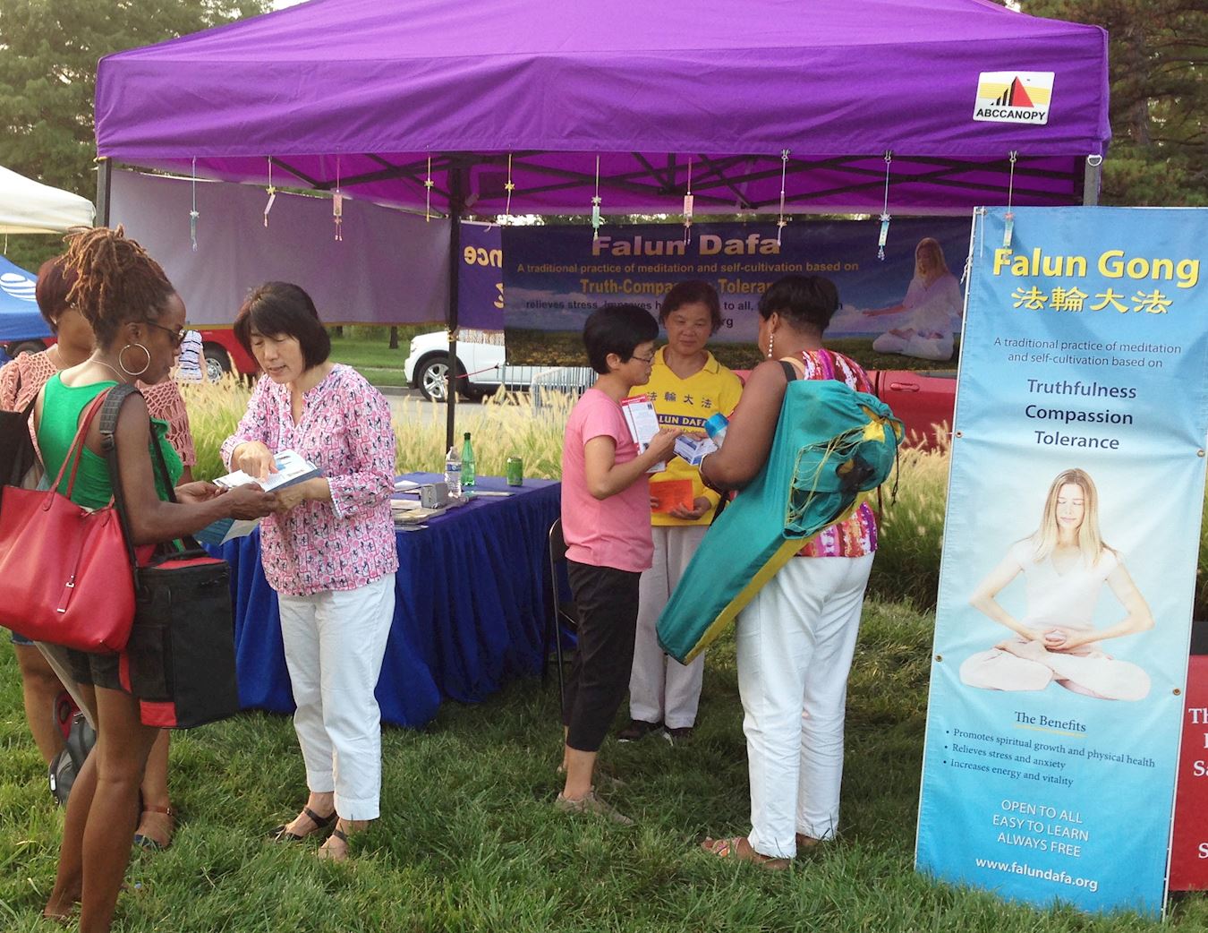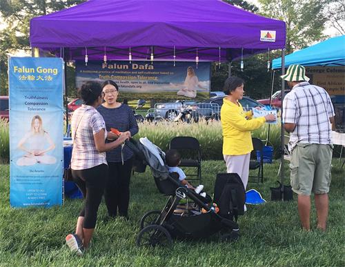 一位印度女士推着儿童车路过展位,停下来与法轮功学员交谈了很久。她说自己刚从(加拿大)多伦多搬过来,在医院上班,从事与心理学相关的工作。她正在寻找一些打坐和冥想的方法,想介绍给她的病人。得知修炼法轮功可以强身健体,对身体健康有好处后,她很感兴趣,表示要和妹妹一起来学炼法轮功。