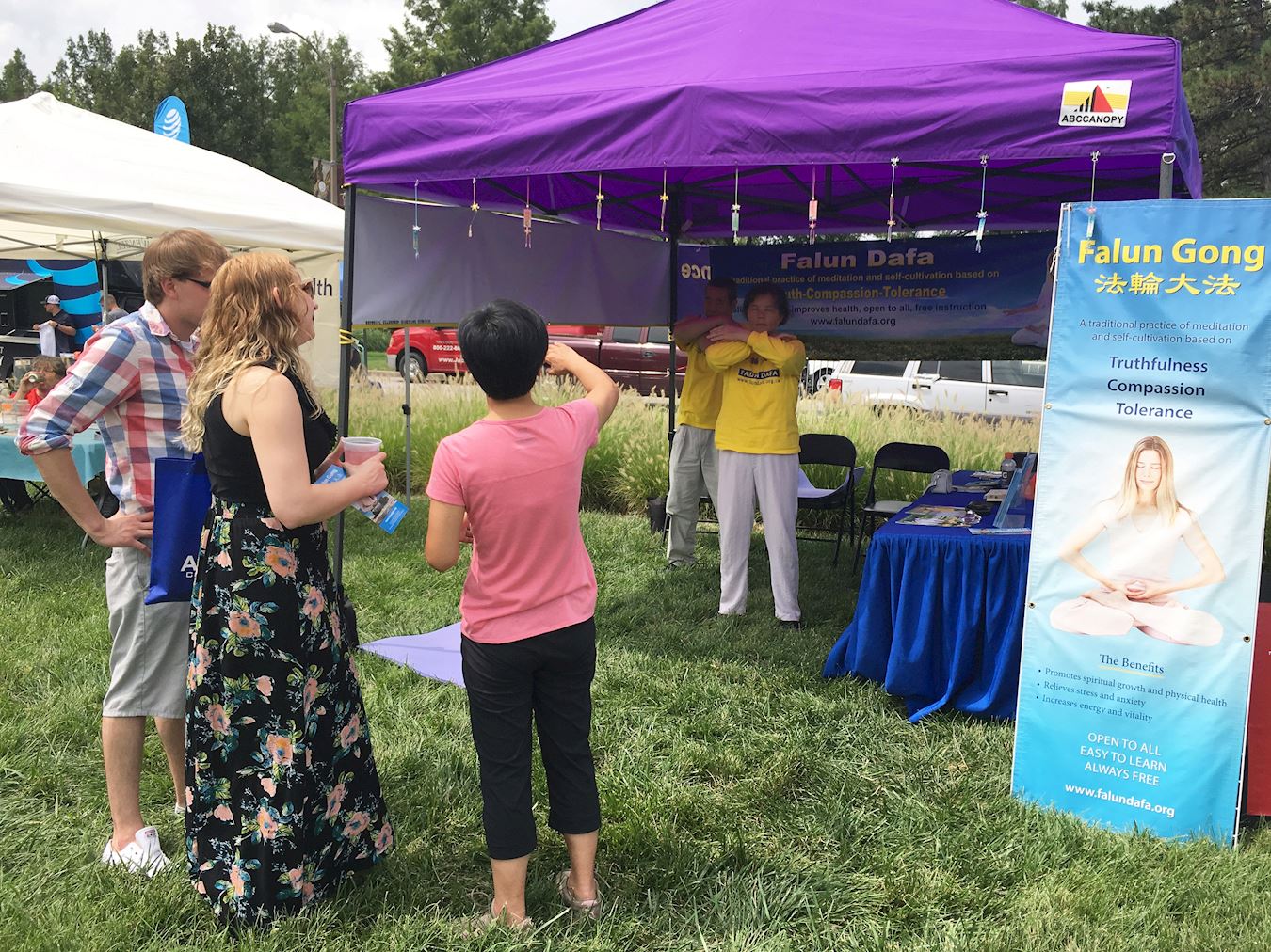 法轮功学员在展位前派发资料,演示功法。来往的人们被这优美、祥和的功法所吸引。一些人走上前来了解详情,或当场学炼功法,有的人在学炼功法的过程中感到手心有很强大的能量在流动,还有人在炼完功法后表示感觉很舒服。