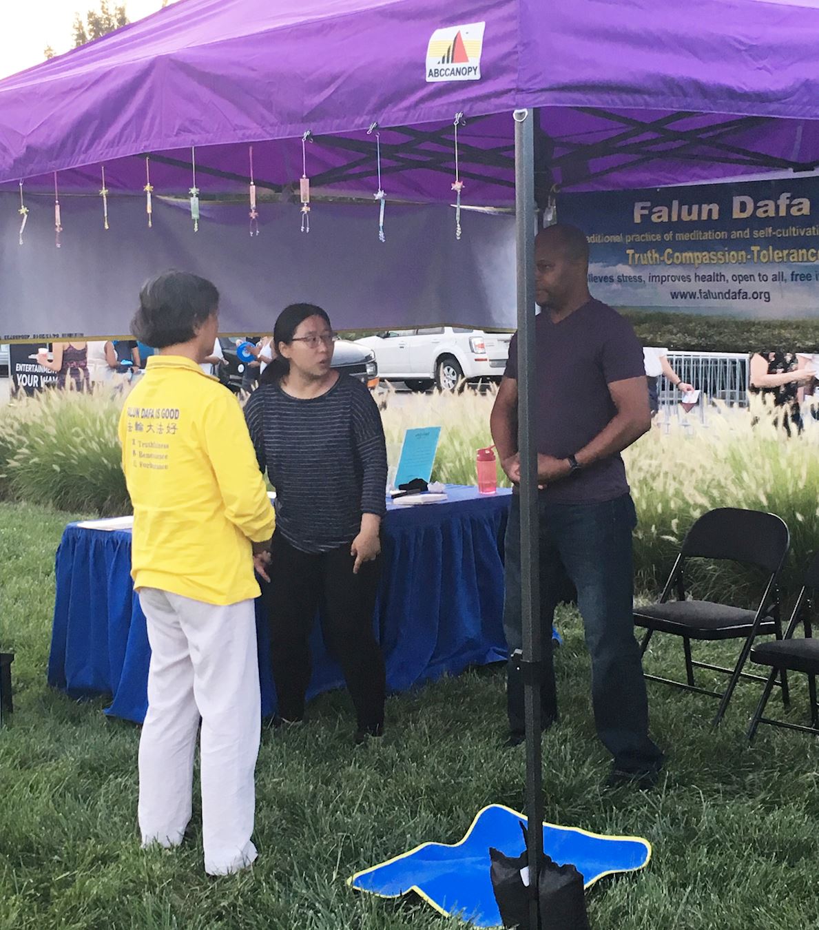 一位名叫贾维斯(Jarvis)的男士来到法轮功展位,了解真相后静静看着功法演示。学员见他很感兴趣,邀请他来学炼功法。他学起来很快,动作也颇为标准,学员的讲解他也表示能够听明白。