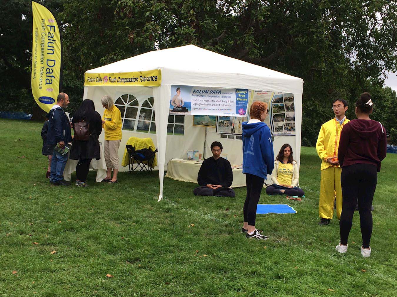 法轮功学员舒缓的功法演示,吸引了很多人来现场学功:有一群人,是亲朋好友六个人一起来的,听完简单的功法介绍后,六人围成一个圆形站立,跟着学员学了第一套功法,接着又学了第二套功法,然后,他们当中的一个中年男士克里斯(Chris)表示还要接着往下学,当学完另外三套功法后,他和法轮功学员谈了很多的感受,他说:“在炼功时,脑中所有的思绪杂念都没有了,丝毫感觉不到周围的嘈杂,很放松。”