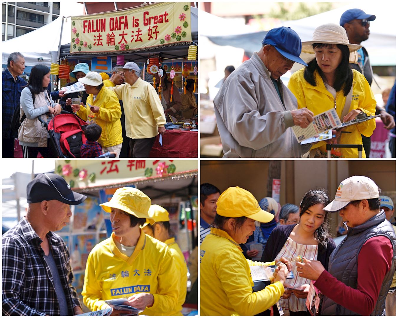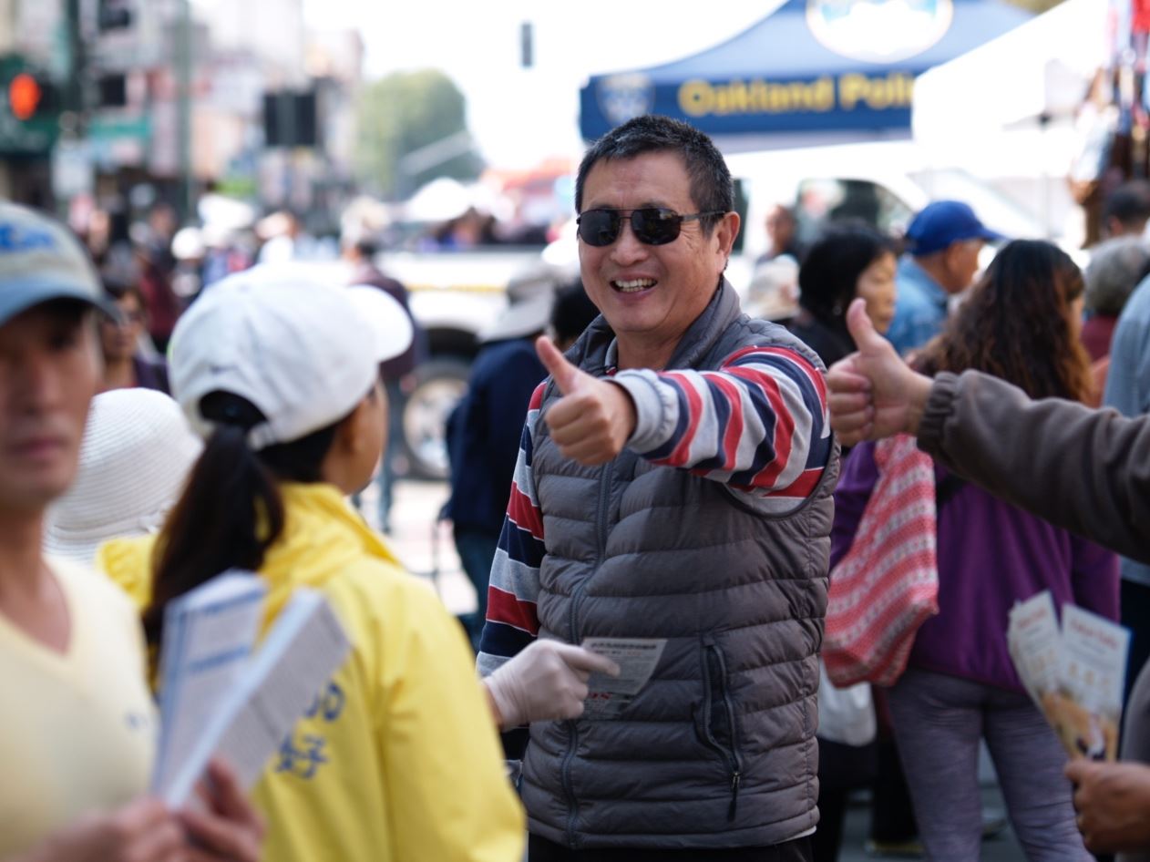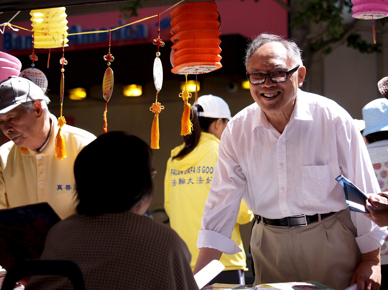 也有的已经了解真相的华人看到法轮大法的摊位后,径直走向学员,问有没有法轮大法书。学员就告诉他们可到法轮大法网站(www.falundafa.org)上阅读或下载。八十多岁、住在奥克兰东边山脚下的约翰(John)先生说自己不会上网,只有一部座机在家里。他说:“我要修炼法轮功,到哪里能买到《转法轮》这本书?”于是学员领着他到中国城附近的书店买了大法书。第二天中午他又前来展位学了第一套功法,并表示会与学员每周保持联系,他想参加法轮功的活动。