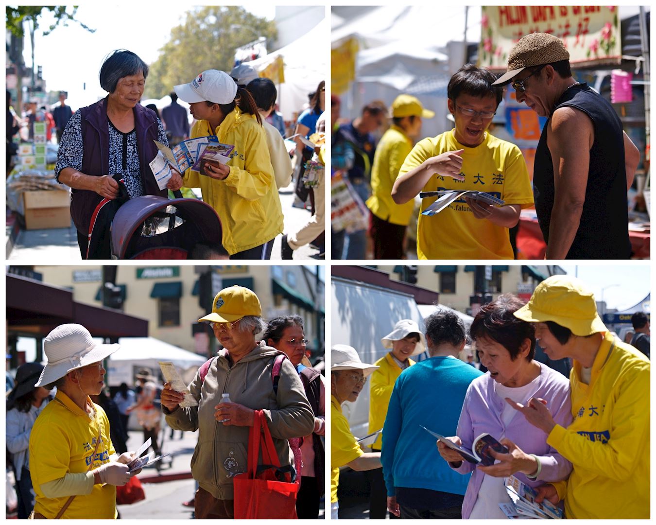 奥克兰市居住了许多从中国大陆(特别是广东地区)移民来美的华人,他们经过法轮功摊位时,有的驻足阅读真相展板,有的高兴地与学员攀谈,有的跟学员说,我昨天就来过了,今天来想看还有没有更多的真相资料……这两天,学员们忙得不亦乐乎,刚跟一位、或一家人讲了真相,一转身,已有另外的游客在摊位前张望……两天下来,有二百四十九位中国人三:退.(退出中共邪*党-,及其团、队组织)。