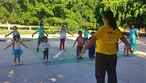 两位当地的法轮功学员受邀正在一个宽敞明亮的教室里、教学生学炼法轮功的第五套功法。学生们都盘着腿席地而坐,安静地打坐,教室里充满一片平和祥静。这是第三个学年法轮功学员来到这所将幼儿园和小学综合在一起的私办学院,在该学院校长米里安女士的邀请下,来给孩子们担任蒙氏教育法的规定课程之一——和平教育课程的义务讲师。