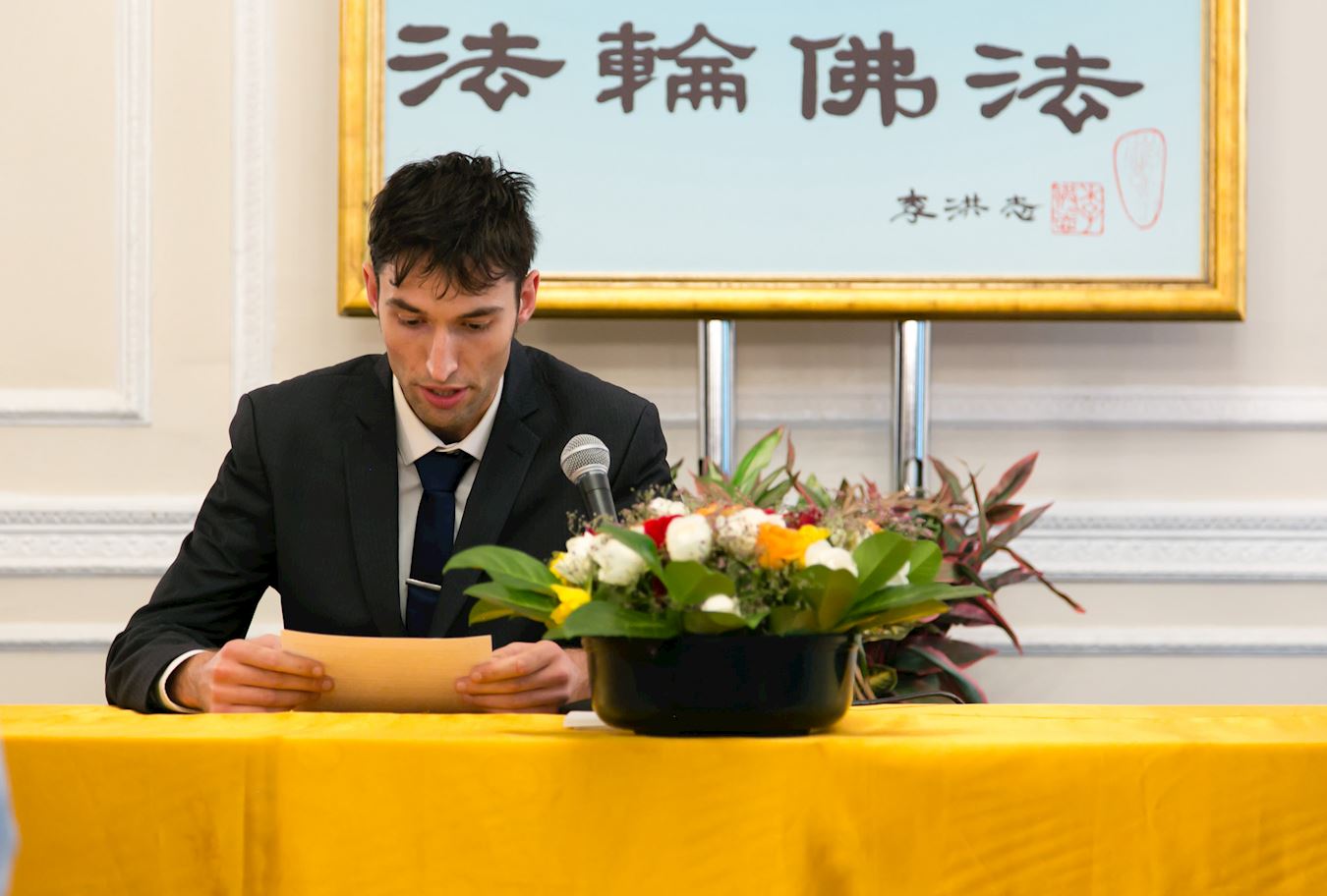 英国西人学员尼尔·伍德罗(Neil Woodrow)在法会上分享了自己两年来通过加强自我修炼从而能更好的证实法的修炼经历。他注意到,自己日常生活中的事及他直接参与的大法项目能否顺利進行,与他自身修炼状态有极大关系。他下决心要听师父的话,认真做好三件事,走好师父慈悲安排的正法时期大法弟子的路。