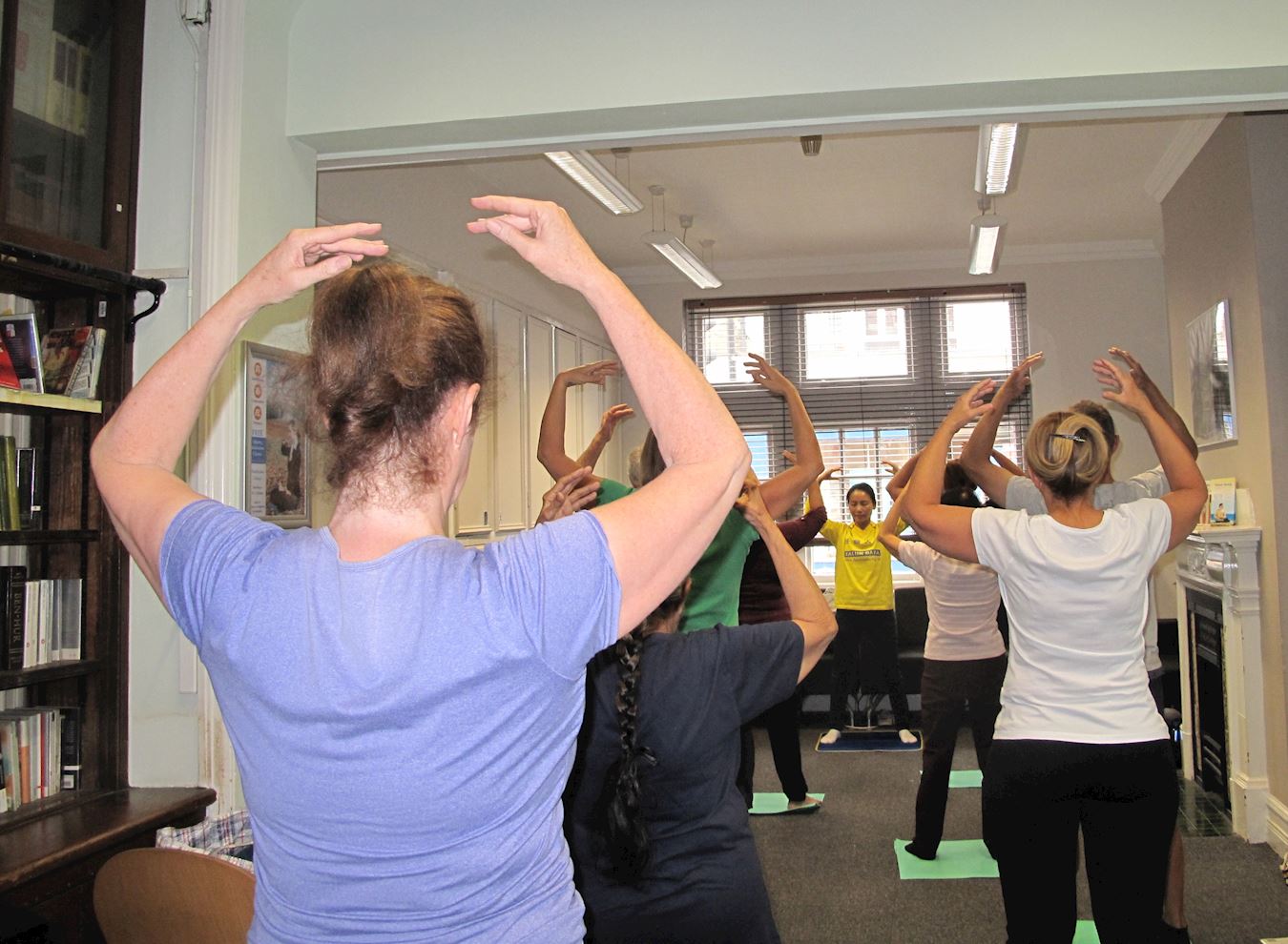 ![]() 图1:二零一八年八月十八日,温布尔登图书馆的法轮功义务教功班上,法轮功学员温迪(Wendy)和大家一起炼功 |