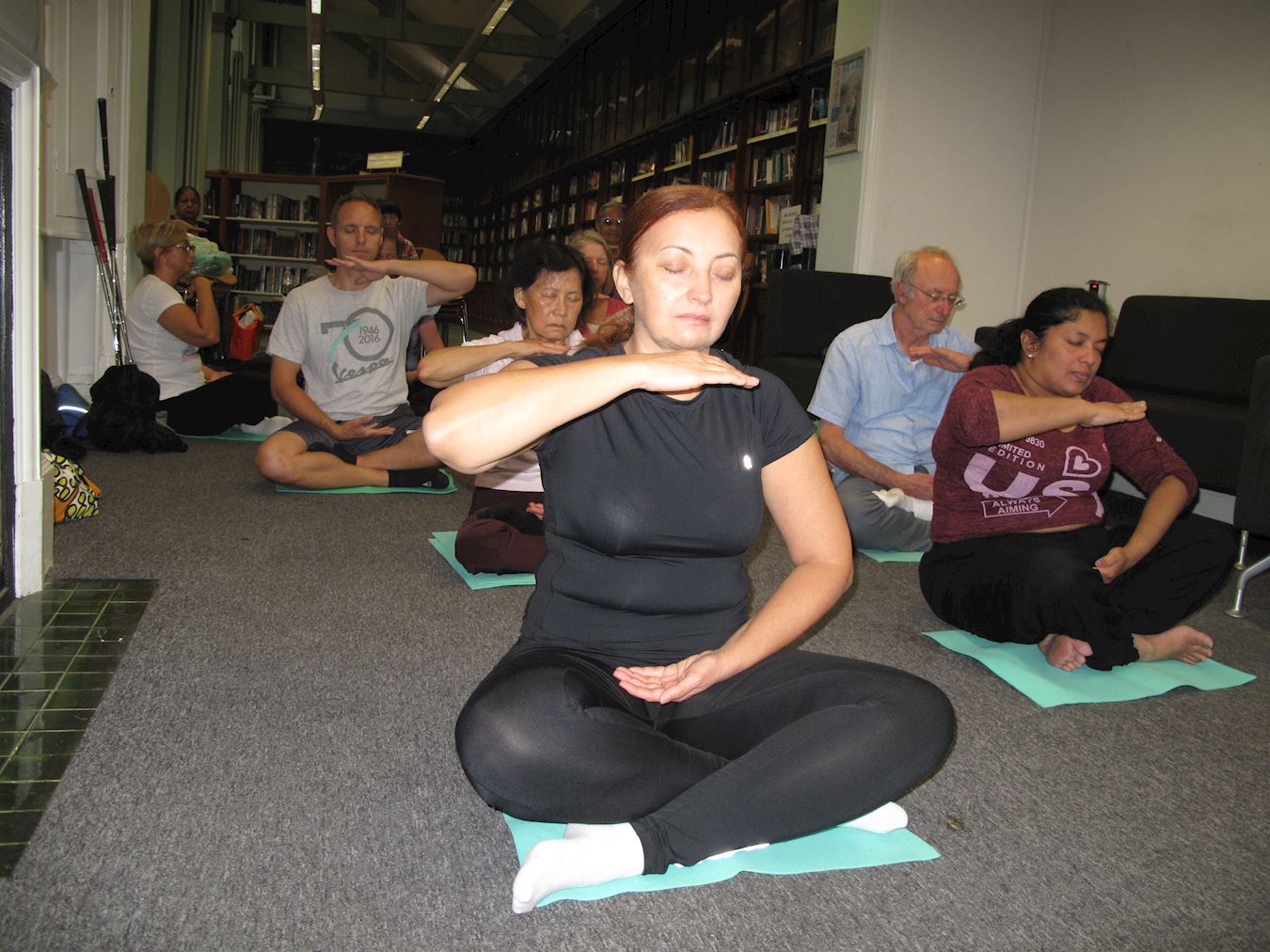 ![]() 图2:二零一八年八月十八日,温布尔登图书馆的法轮功义务教功班上正在打坐的学员。右边第一位印度裔女士是第一次来,左边一位来自前东欧国家的女士是第三次来。 |