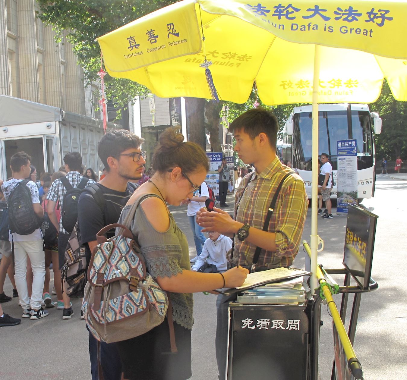 ![]() 图2:一对青年游客驻足认真了解真相后签名支持法轮功反迫害 |