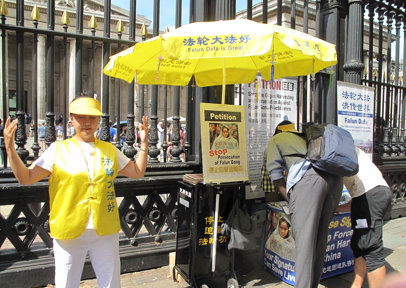 在大英博物馆正门外,身着金色服饰的法轮功学员站在明黄色的伞下炼功,一旁竖着真相展板。阳光下,来自世界各地的参观者看到了同样的清晰鲜明信息:“法轮大法好”、“真善忍”、“法轮大法弘传世界”、“停止迫害法轮功”。