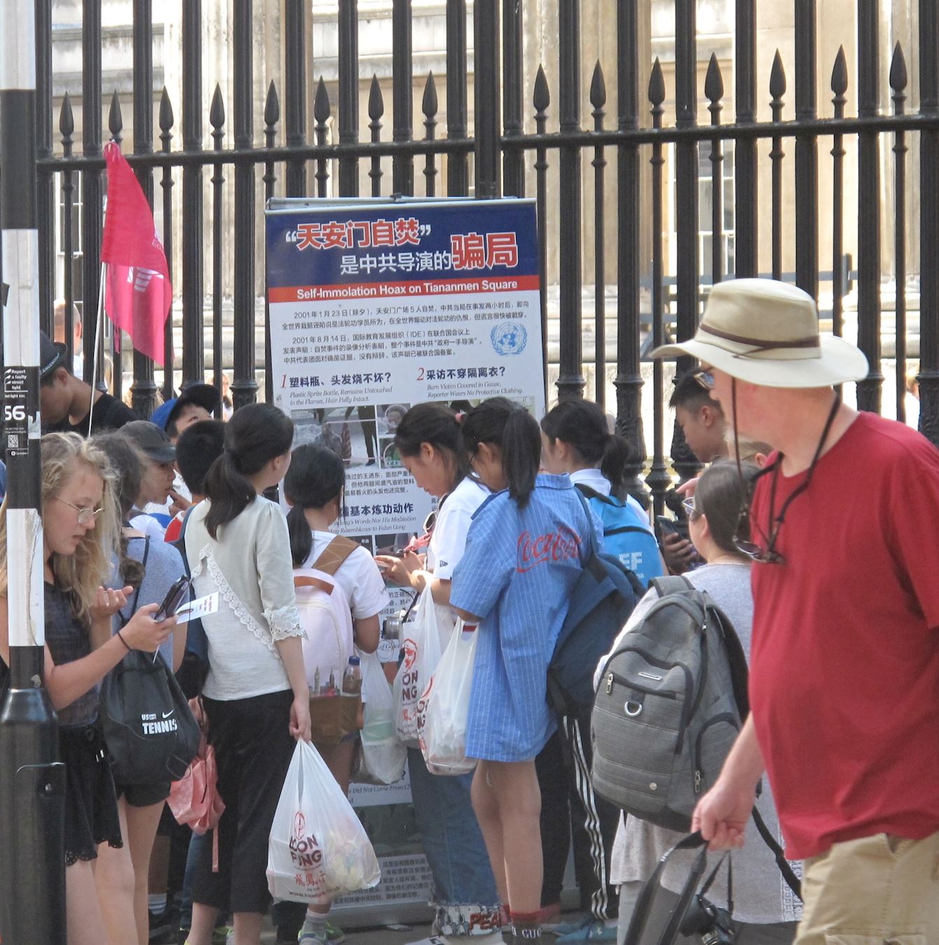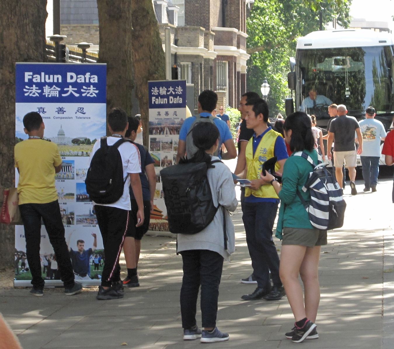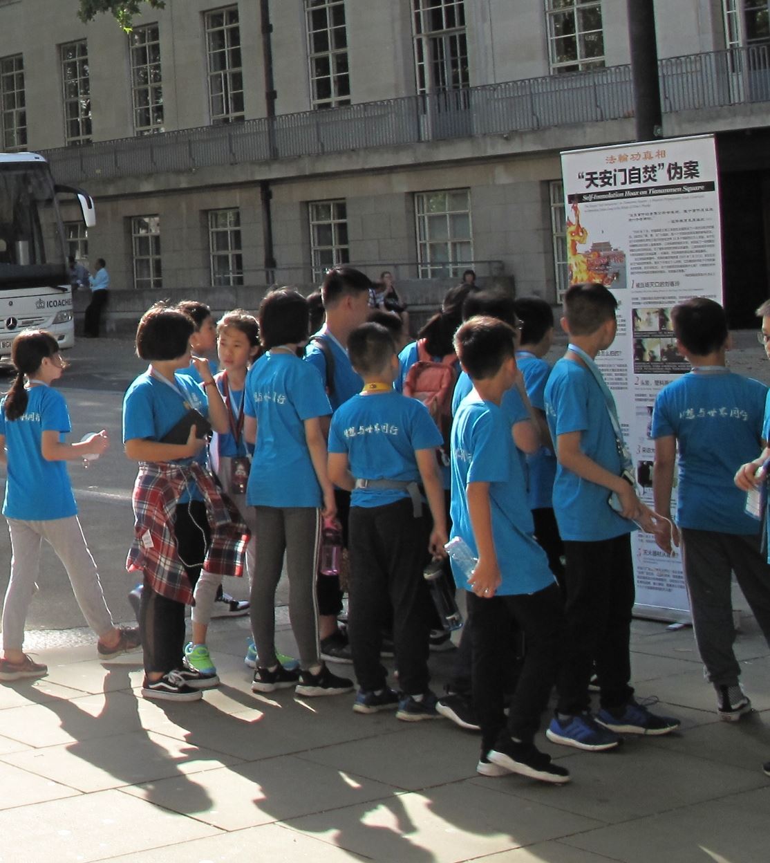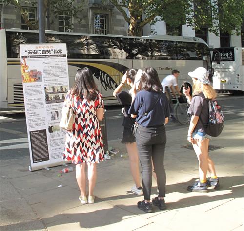 法轮功学员在大英博物馆后门入口和出口附近、在来接游客的旅游大巴停靠点附近布置真相展板,其中包括大法洪传世界、揭露中共“天安门自焚”谎言骗局、三:退.保平安、控告江泽民等内容。很多人从这些展板了解到法轮功基本真相,越来越多的中国人在震惊中发现“天安门自焚”是中共导演的骗局。