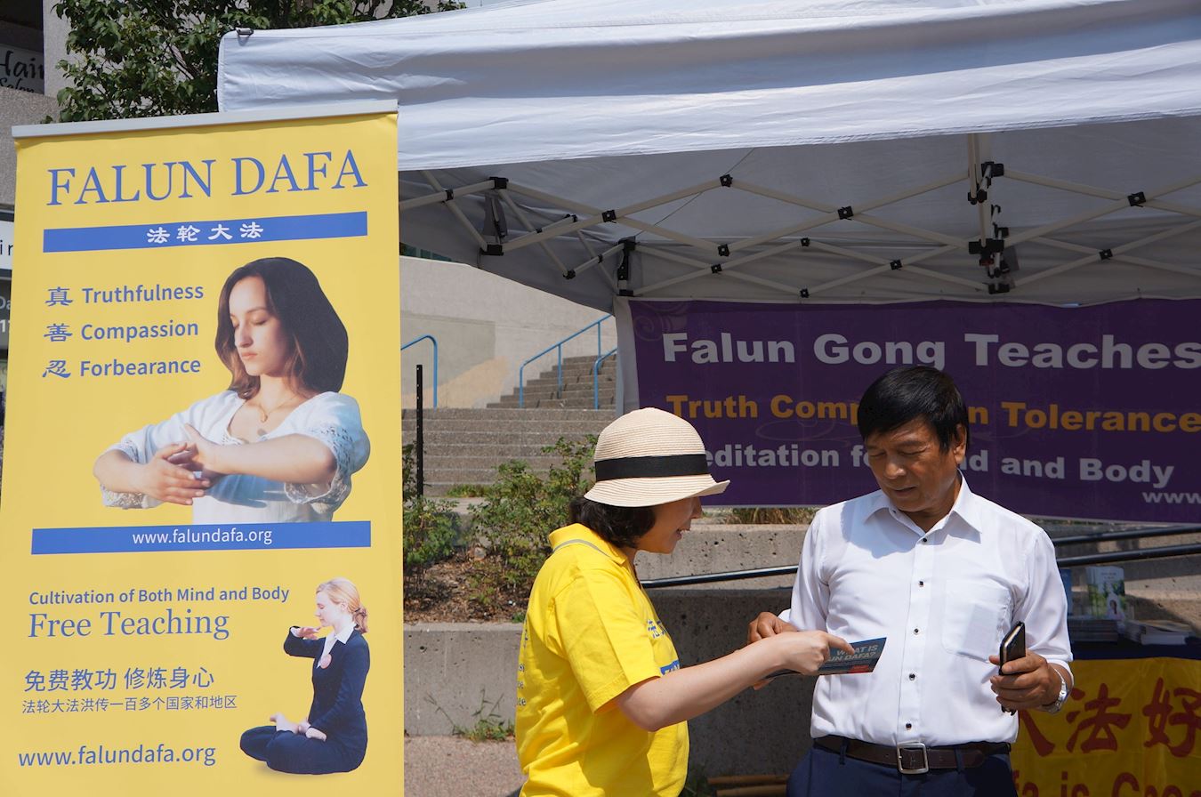 来自沈阳的大陆移民孙先生在多伦多生活已有十几年了。看到法轮功学员正在义务教功,他停下了脚步,和一位学员攀谈了起来。聊天中,孙先生表示自己非常清楚目前中国大陆的现状,说中国共产党养肥的都是贪官污吏,遭殃的是百姓。孙先生表示在大陆长大的很多中国年轻人没有辨别是非的能力,以自我为中心,总是想着自己如何如何。在了解到法轮功学员可以帮中国人声明“三:退.”(退出中共党、团、队)时,孙先生果断同意“三:退.“了。